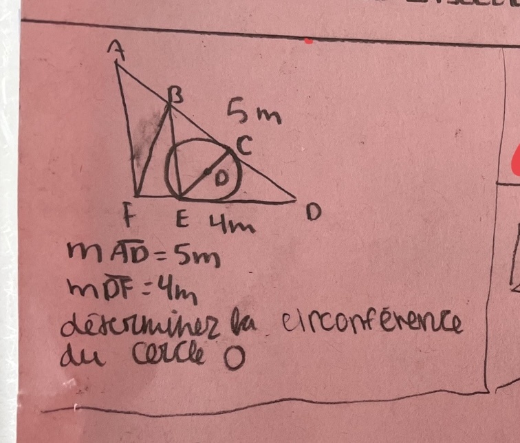j’ai besoin d’aide pour calculer la circonférence du cercle. Désolé du dessin et de l’écriture affreuse…