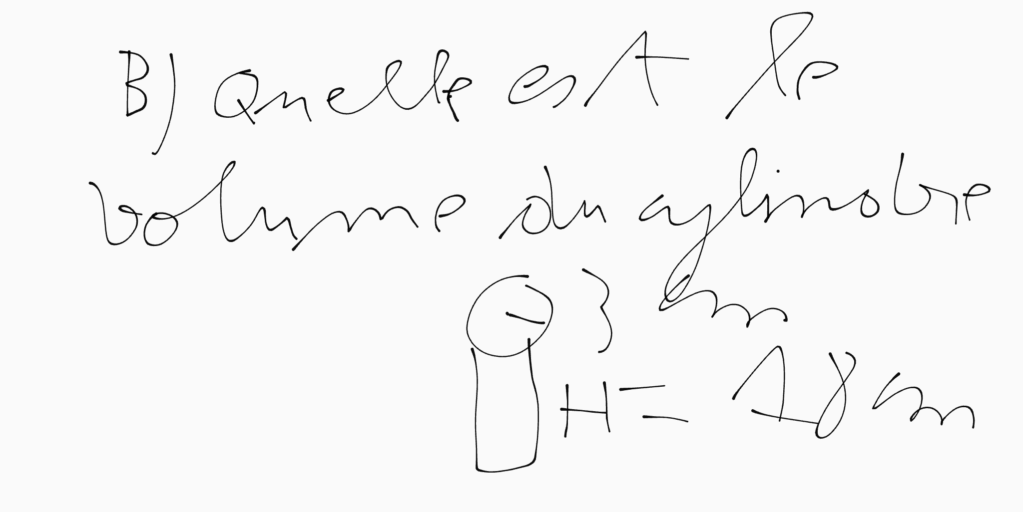 Secondaire 1 • 2aVoici le devoir que mon pere ma donnéB)Quelle est le volume du cylindre le rayon est a 3 cm et la hauteur est a 18 cm