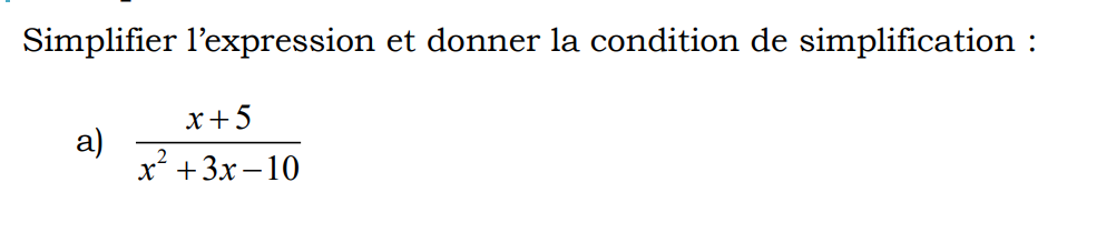 Secondaire 5 • 2aBonsoir, je en comprends pas pourquoi ils ont ecris 5, au lieu de -2, car on a simplifier et le x plus cinq ce sont annulé en haut et en bas, je crois que c'est un peu le francais la question qui mne melange
