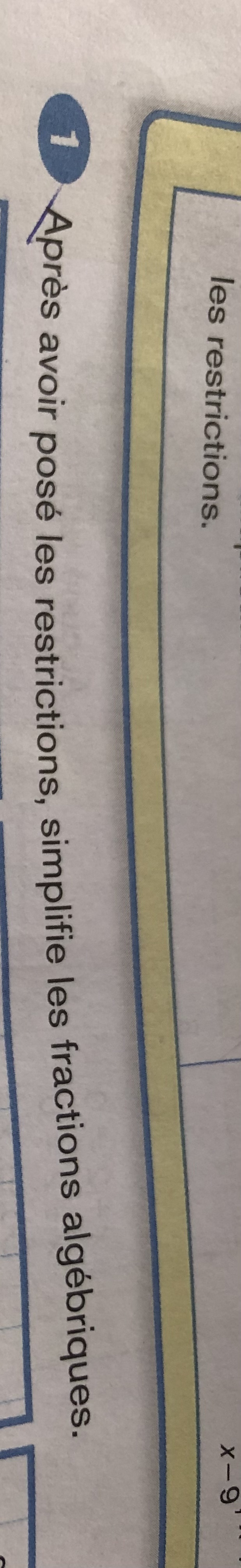 Secondaire 4 • 3aBonjour pouvez vous m’aidez. Je ne comprend pas comment faire les restrictions svpp ce devoir est pour demain. Ce sont des express rationelles.Merci. Donnez moi juste un exemple parmi les 3 et je ferai les 2