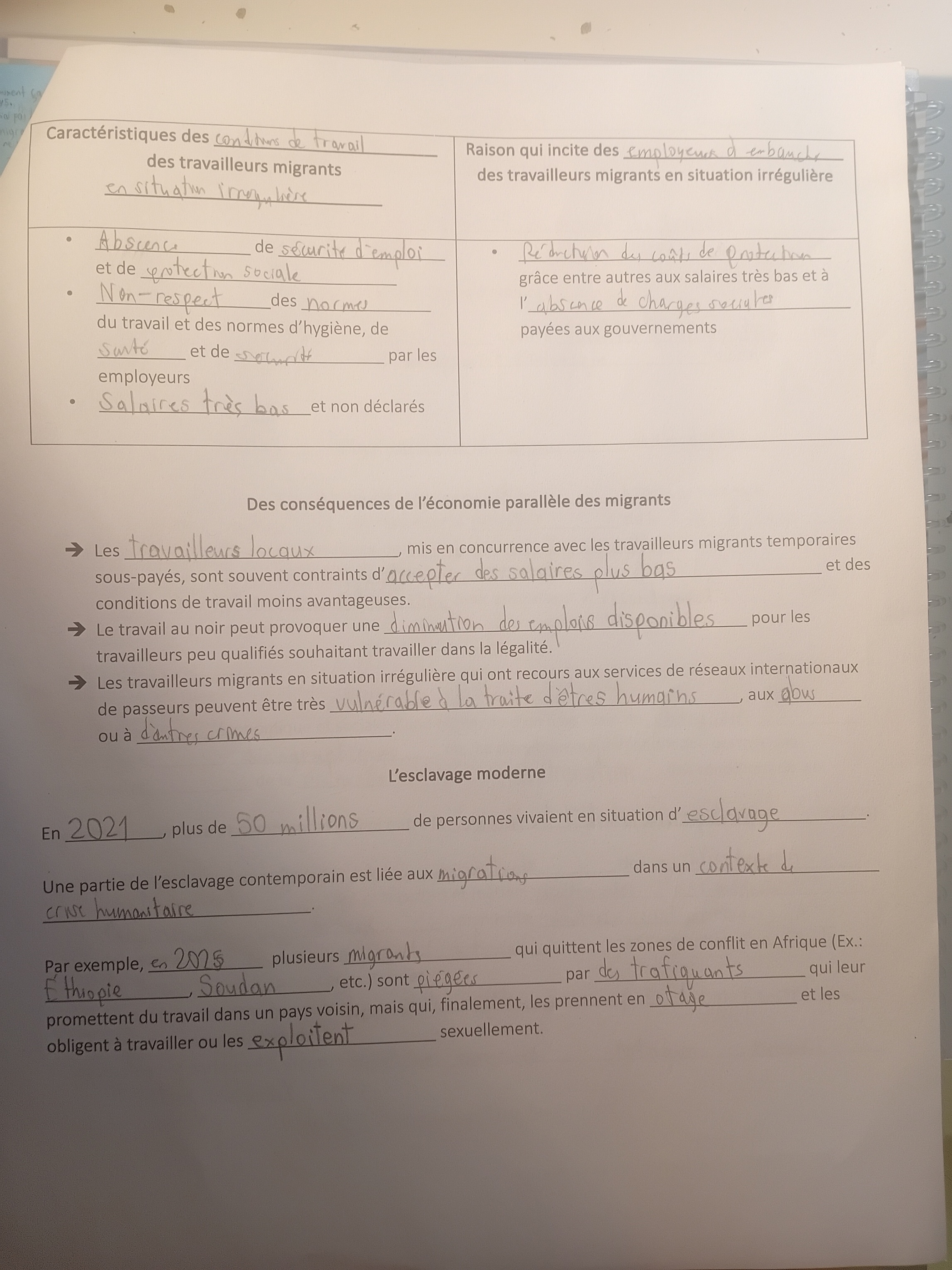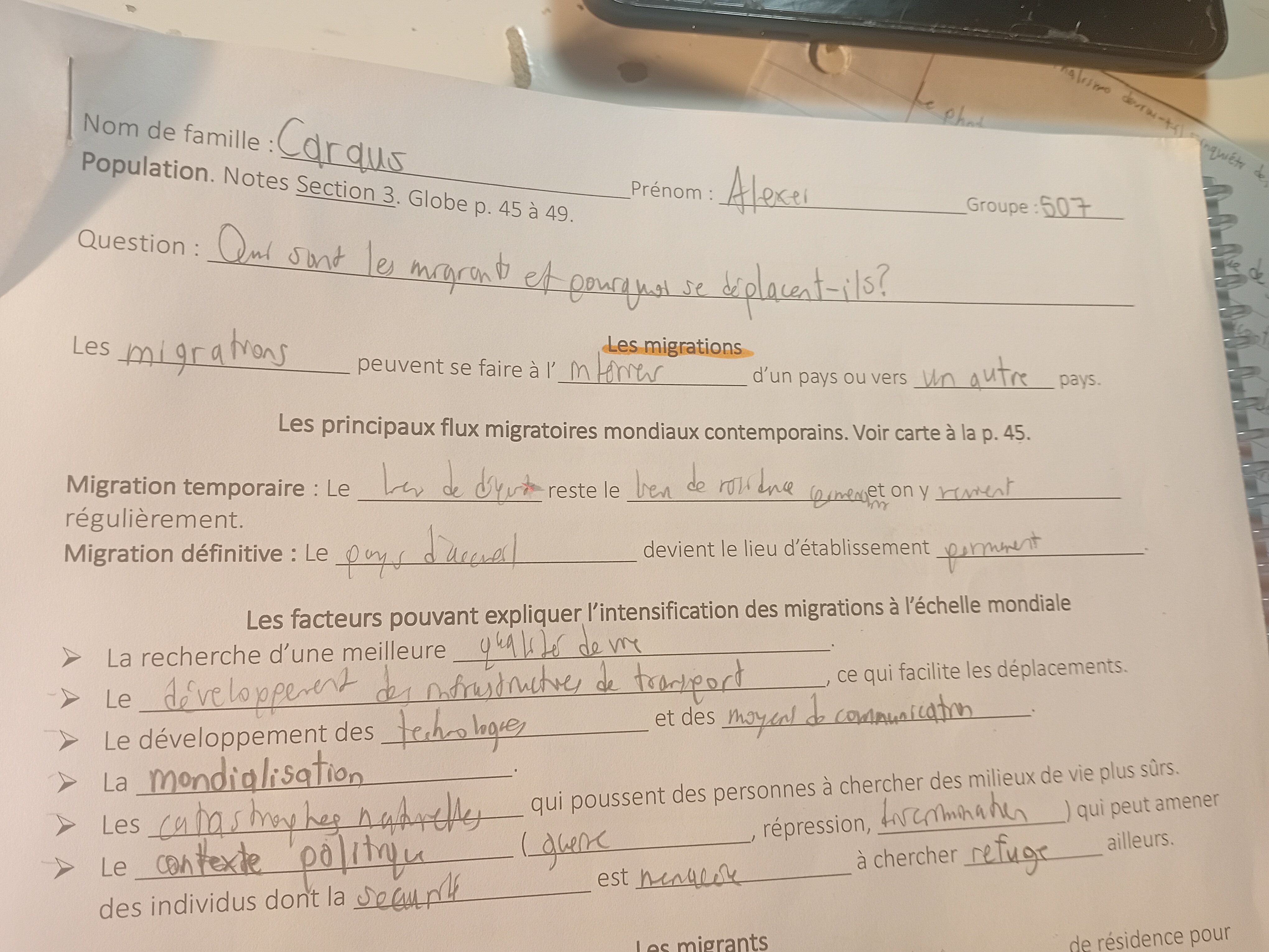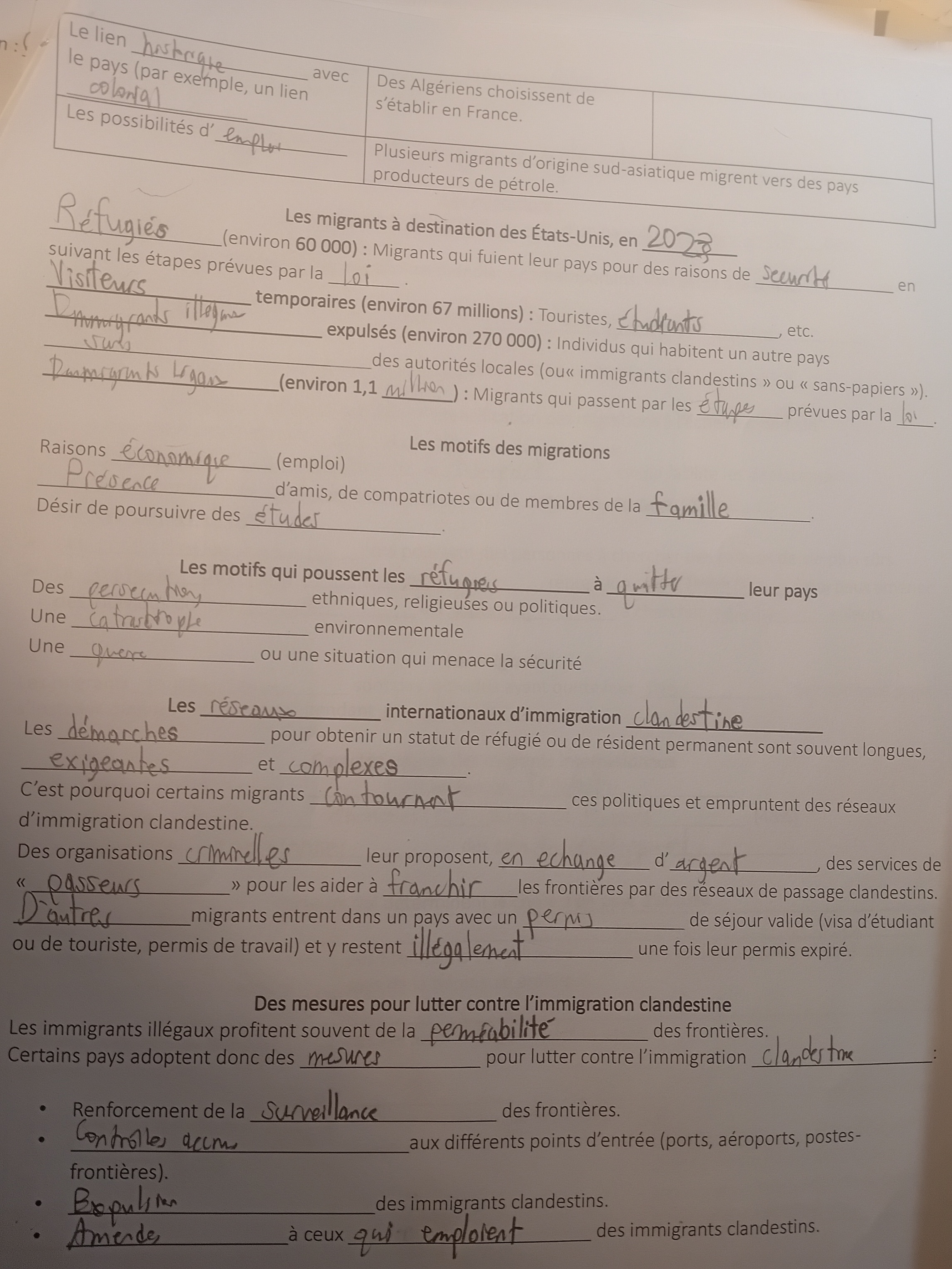 5) Bonjour sur ma feuille, il y a deux fois le mot motif qui se répète donc je n'arrive pas à comprendre les motifs des migrations en quittant leur pays. Ce que je ne comprends pas c'est entre les motifs des migrations et les motifs qui poussent les réfugiés à quitter. Je croyais que les motifs entre ces deux( les motifs des migrations et les motifs qui poussent les réfugiés à quitter leur pays) étaient la même chose.