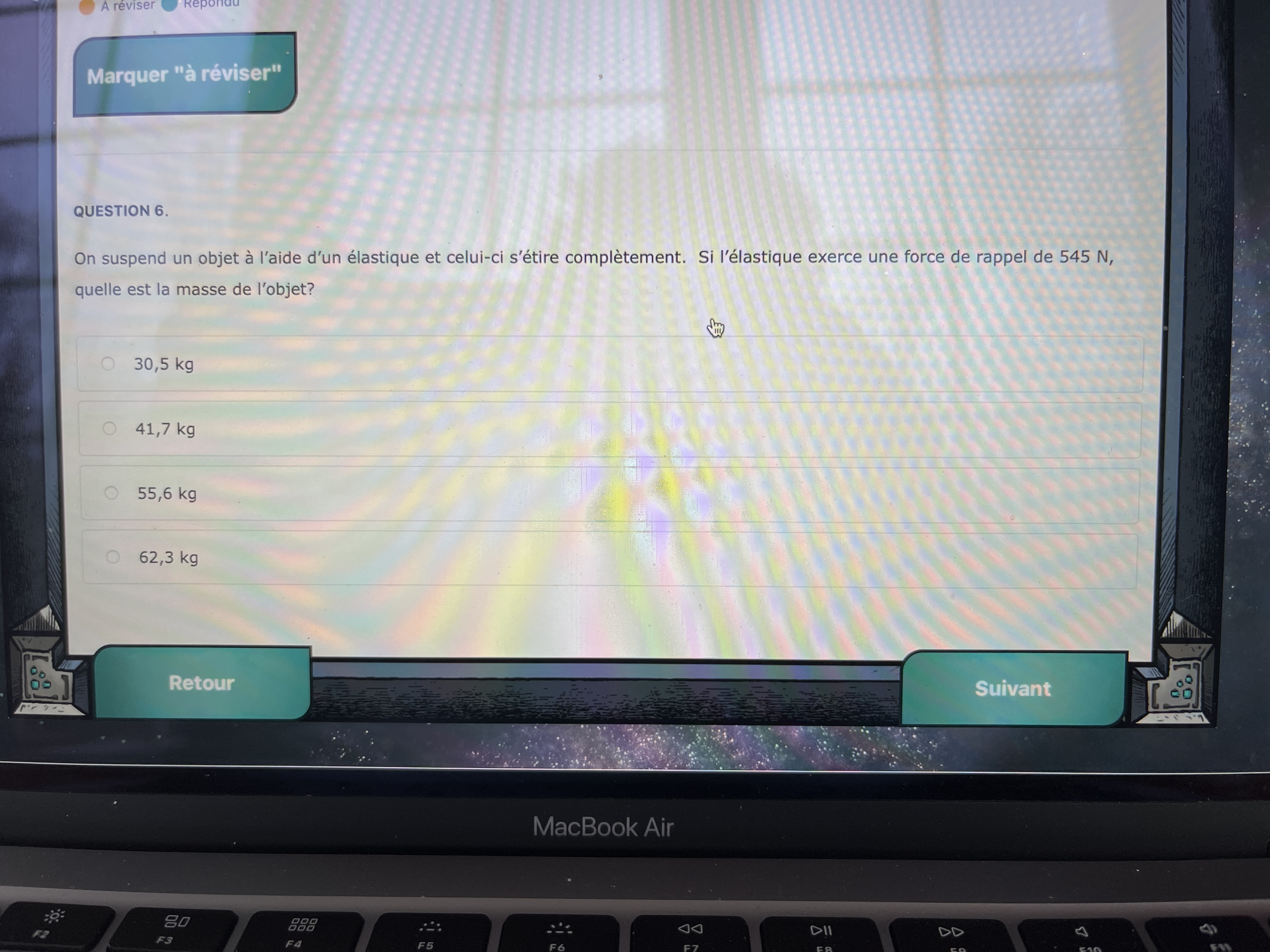 Secondaire 5 • 2aBonjour, je ne sais pas comment trouver la masse à l’aide de seulement la constante de rappel de l’élastique! Pouvez vous m’aider?