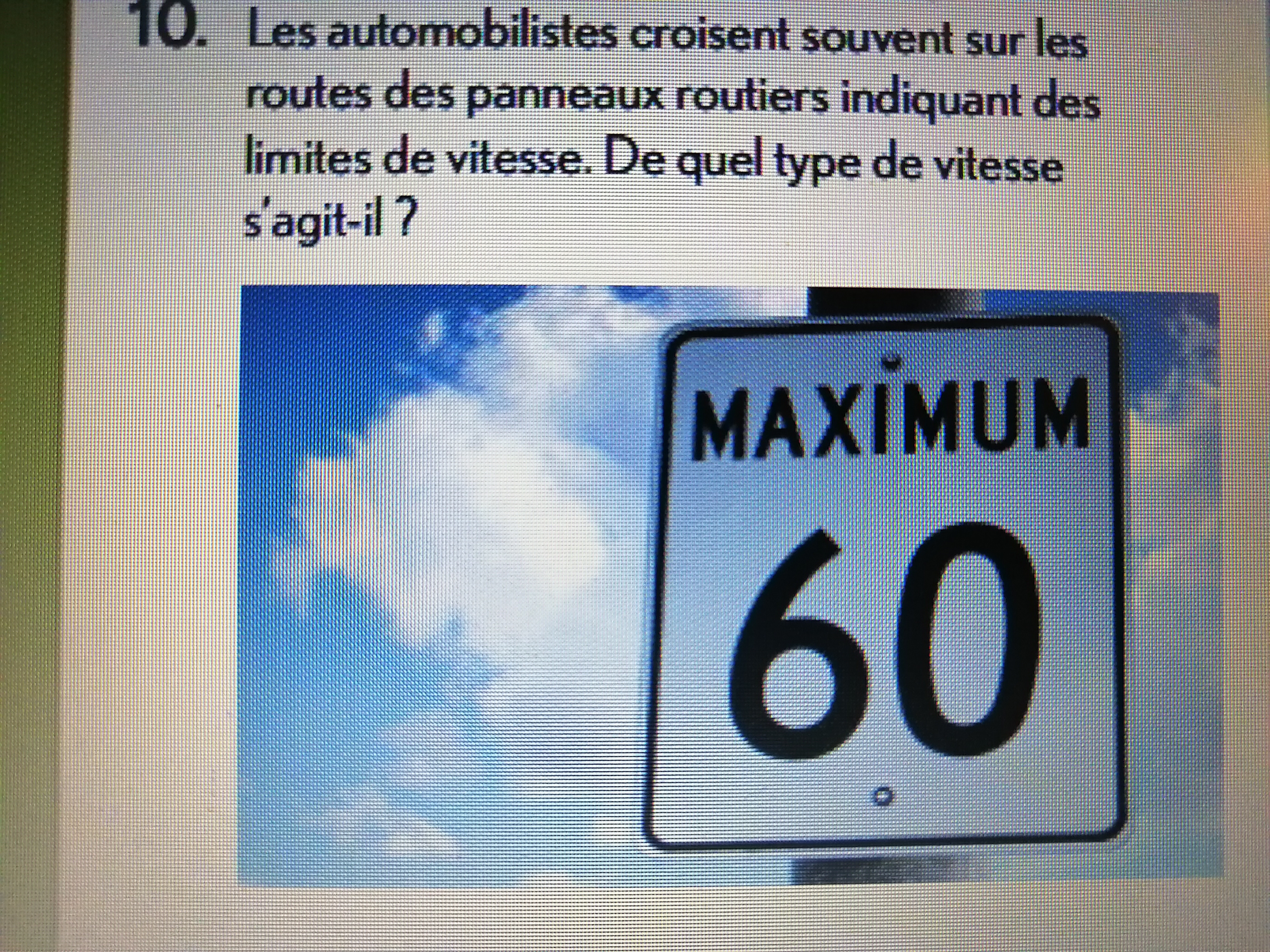 Secondaire 5 • 2aBonjour Alloprof! De quel type de vitesse avant nous à faire ici? Je ne sais pas si c'Est une vitesse instantanée, moyenne ou constante. Selon moi c'est une vitesse instantanée, mais je ne suis pas sûre.