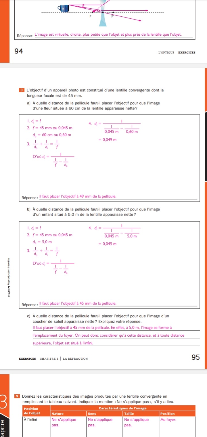 Je fais un laboratoire de physique ayant pour but de déterminer les caractéristiques d'une image se situant entre le foyer objet (Fo ou F') et le point 2f (deux fois la longueur focale) d'une lentille convergente. Bien évidemment, j'ai été capable de supposer qu'elles allaient être les caractéristiques de l'image en traçant les trois rayons principaux. Par contre, il faut expliquer pourquoi nous obtenons ces résultats et je ne sais pas pourquoi. Le professeur a dit qu'il fallait expliquer les résultats avec les principes suivant: la réfringence, la forme de la lentille et la position de l'objet. Comment devrais-je expliquer mes résultats?
