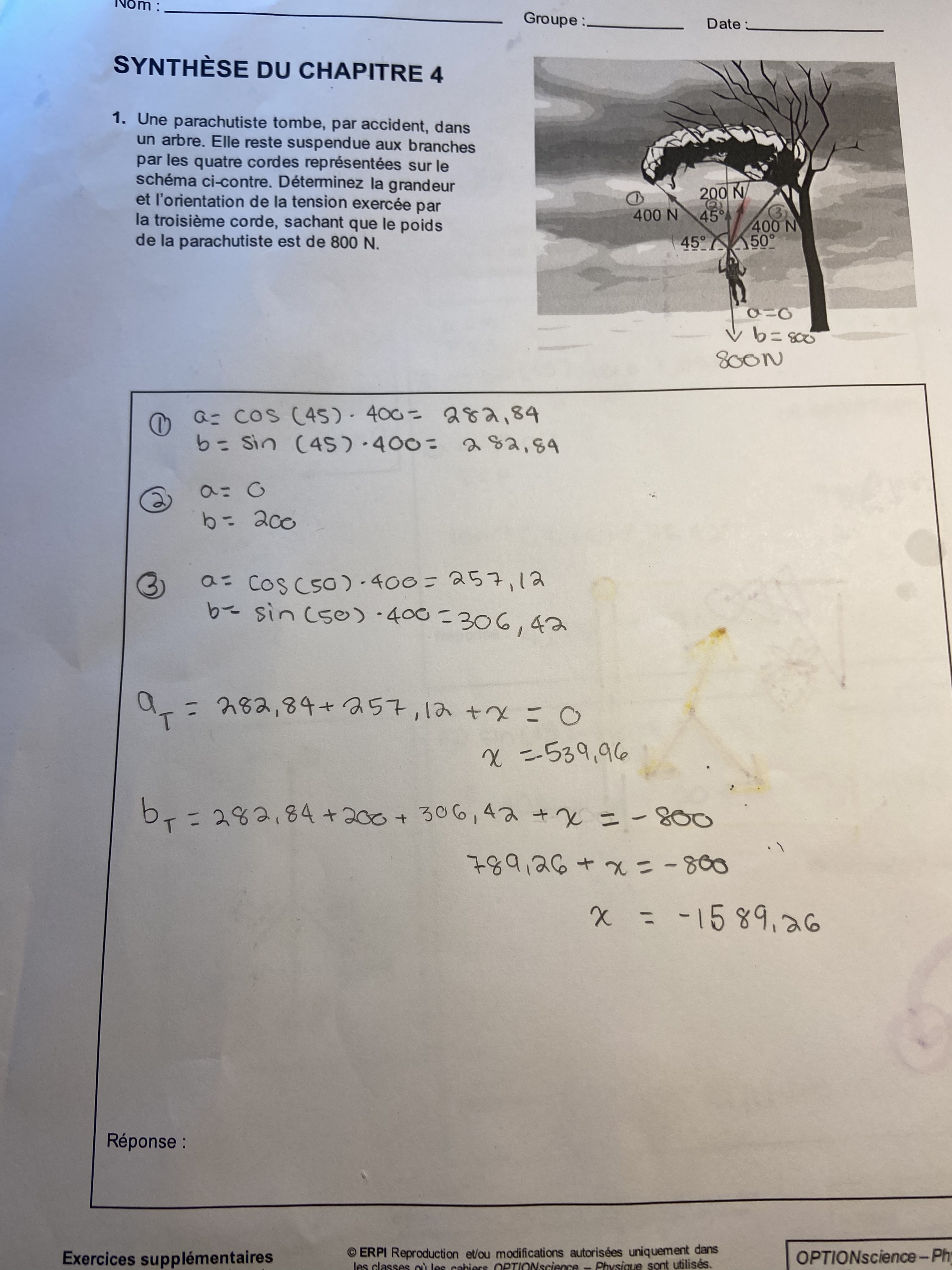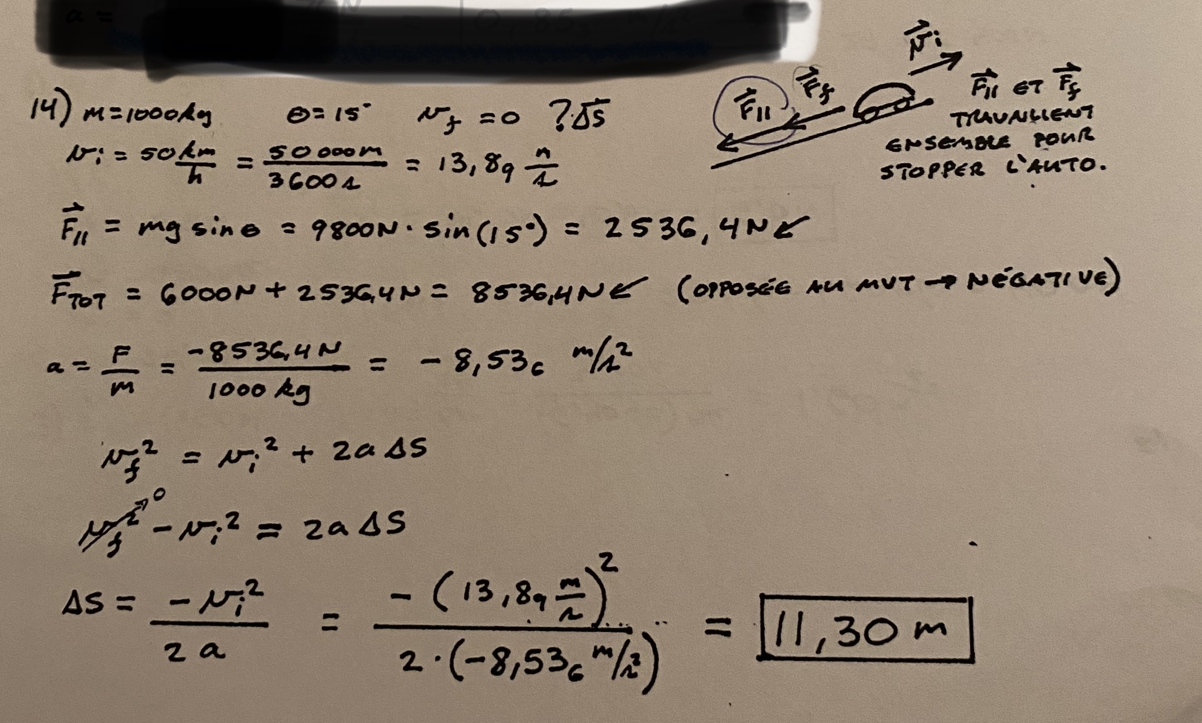 Pour cette question je n’ai pas compris pourquoi la force parallèle et la force de frottement travaillent ensemble pour arrêter l’auto. C’est dans le corrigé que mon prof m’a donner pour cette exercice.