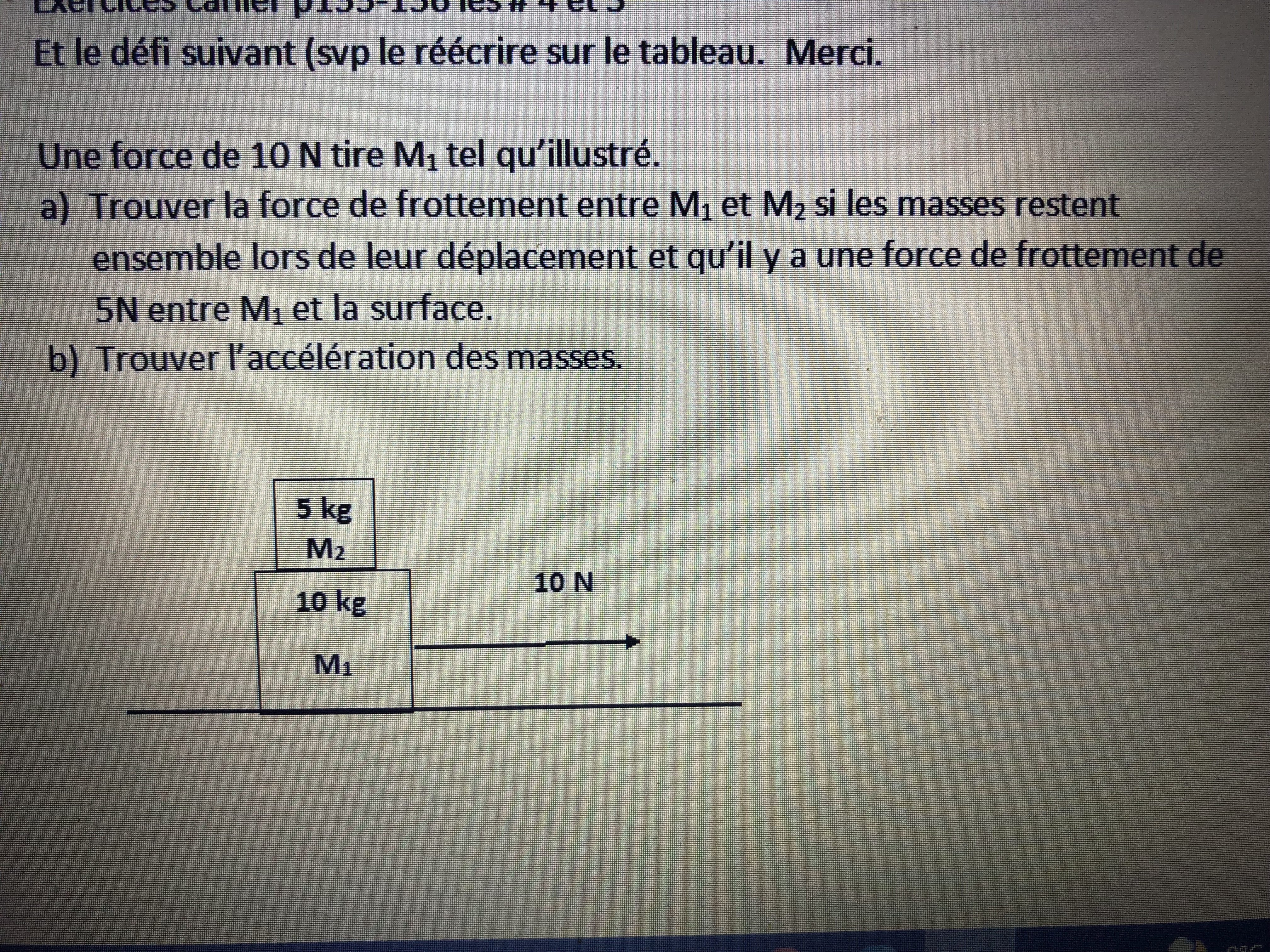 Secondaire 5 • 3aJe ne comprend pas comment trouver la force de frottement entre m1 et m2 (2ime loi de Newton )merci beaucoup