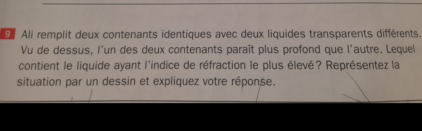 Secondaire 5 • 3aBonjour Alloprof! Si on a deux contenants avec deux liquides transparents différents et que, vu de dessus, l'un d'entre eux parait plus profond, lequel aurait un indice de réfraction plus grand?