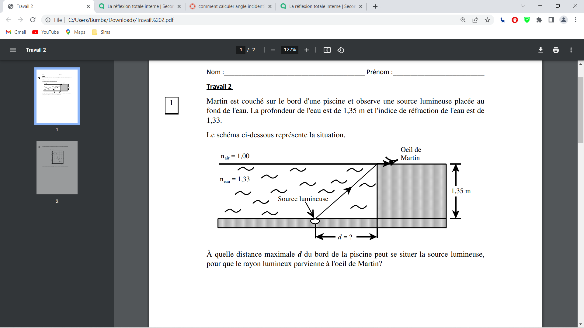 Secondaire 5 • 3aRefraction de rayon lumineuse et indice de refraction