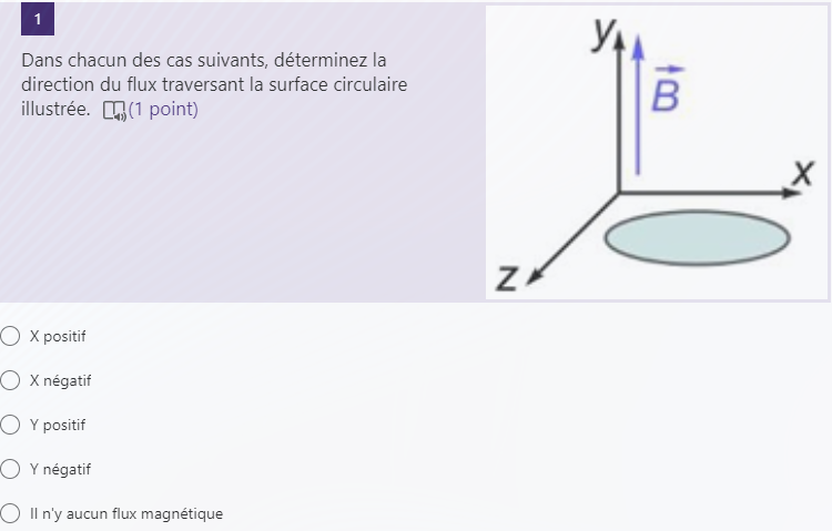J'ai un devoir en physique sur l'induction électromagnétique mais j'ai pas très bien compris cette question. Est-ce que la surface circulaire est un conducteur? Si non, est-ce qu'il n'y a aucun flux magnétique? Ou est-ce que la direction du flux est y positif?