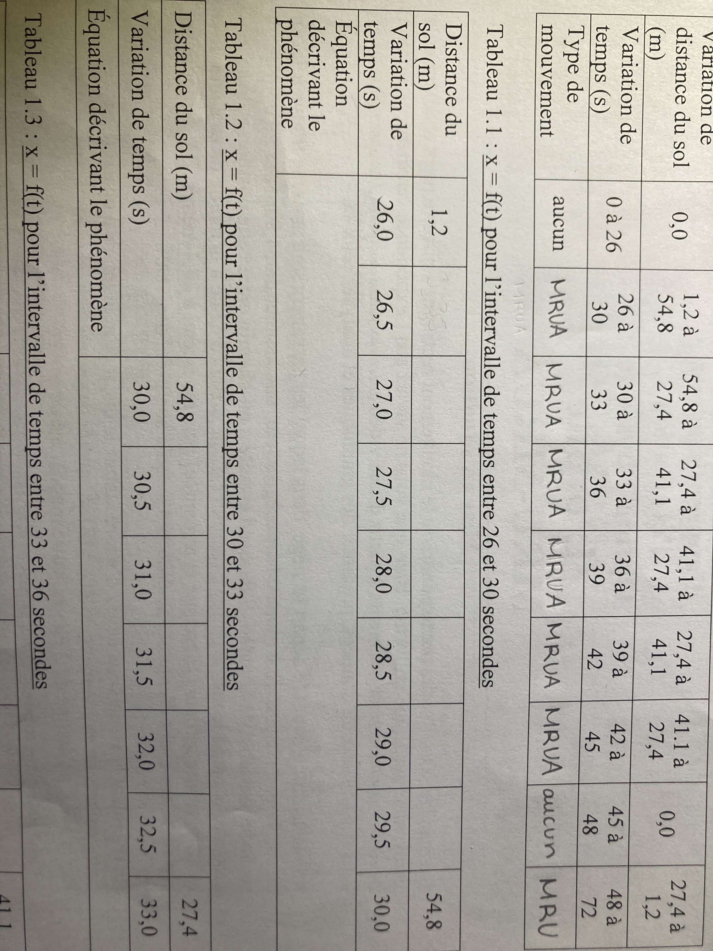 Secondaire 5 • 3abonjou! je dois trouver la distance du sol (m) pour chaque intervalles de temps(s) ci dessous. l’objet fait un mouvement MRUA et sa vitesse initiale est de 0m/s. est-ce que quelqu’un peut m’aider merci! (tableau 1.1)