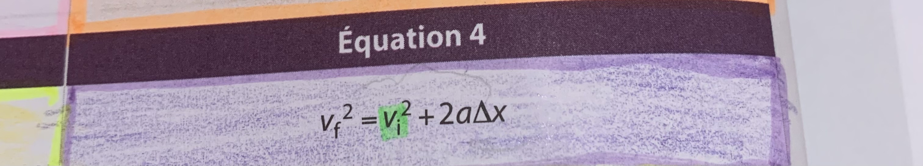 Secondaire 5 • 3aParmi les équations du MRUA, laquelle doit-on utiliser si on connait la vitesse initiale , la vitesse finale et l'accélaration pour trouver delta x(déplacement ou position) à un temps précis donné?