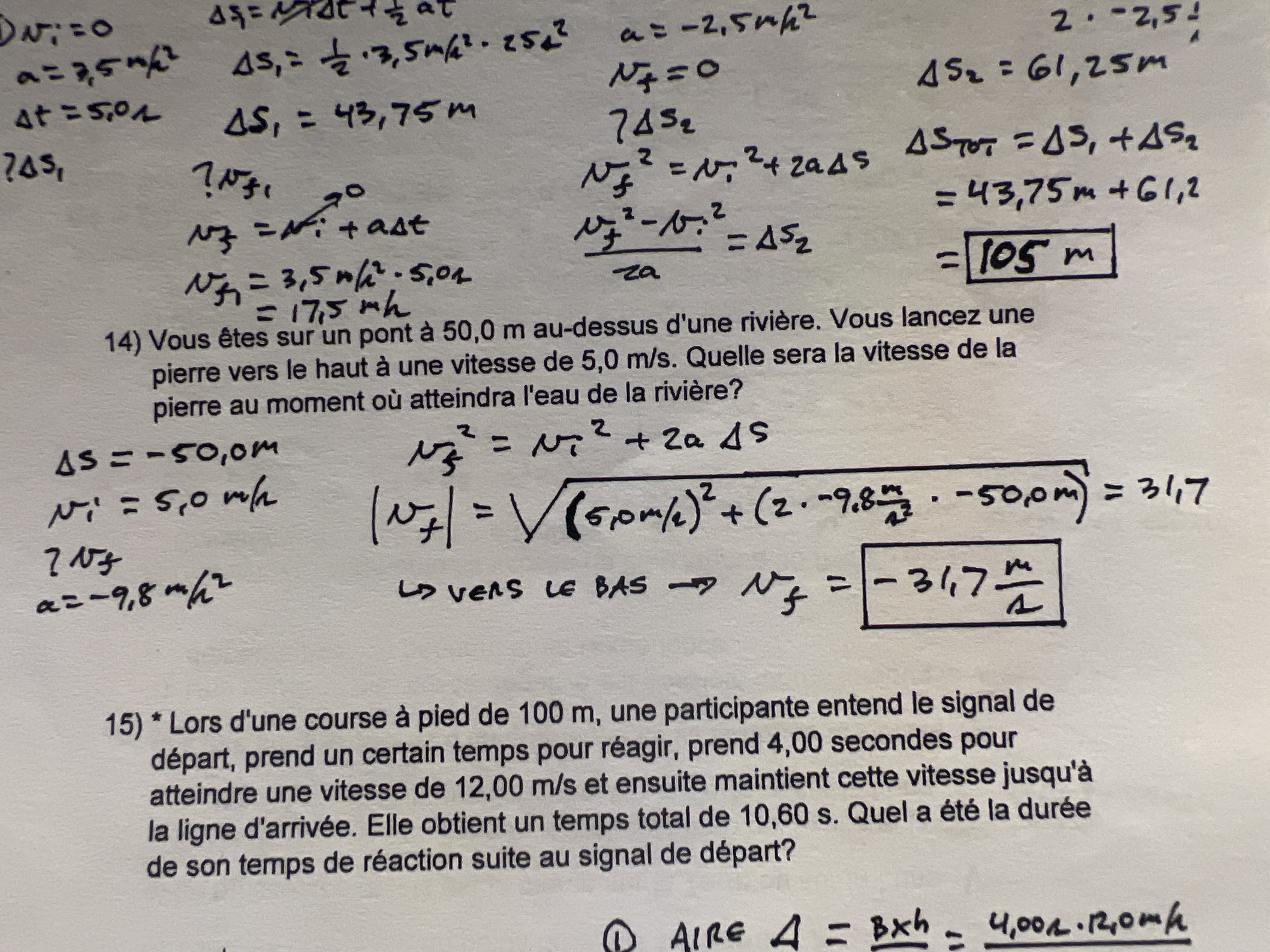 Secondaire 5 • 3apour le 14) je ne comprend pas pourquoi la vitesse initial est 5,0 m/s, car si tu lance la pierre vers le haut de 5,0 m/s, ta vitesse initial devient 5,0m/s et ta vitesse finale devient 0m/s, car sa atteint l’hauteur maximale. Puis c’est cette vitesse finale (0m/s) qui est devrait être la vitesse initiale pour quand la pierre atteint la rivière. Donc pourquoi la vitesse initiale est 5m/s?