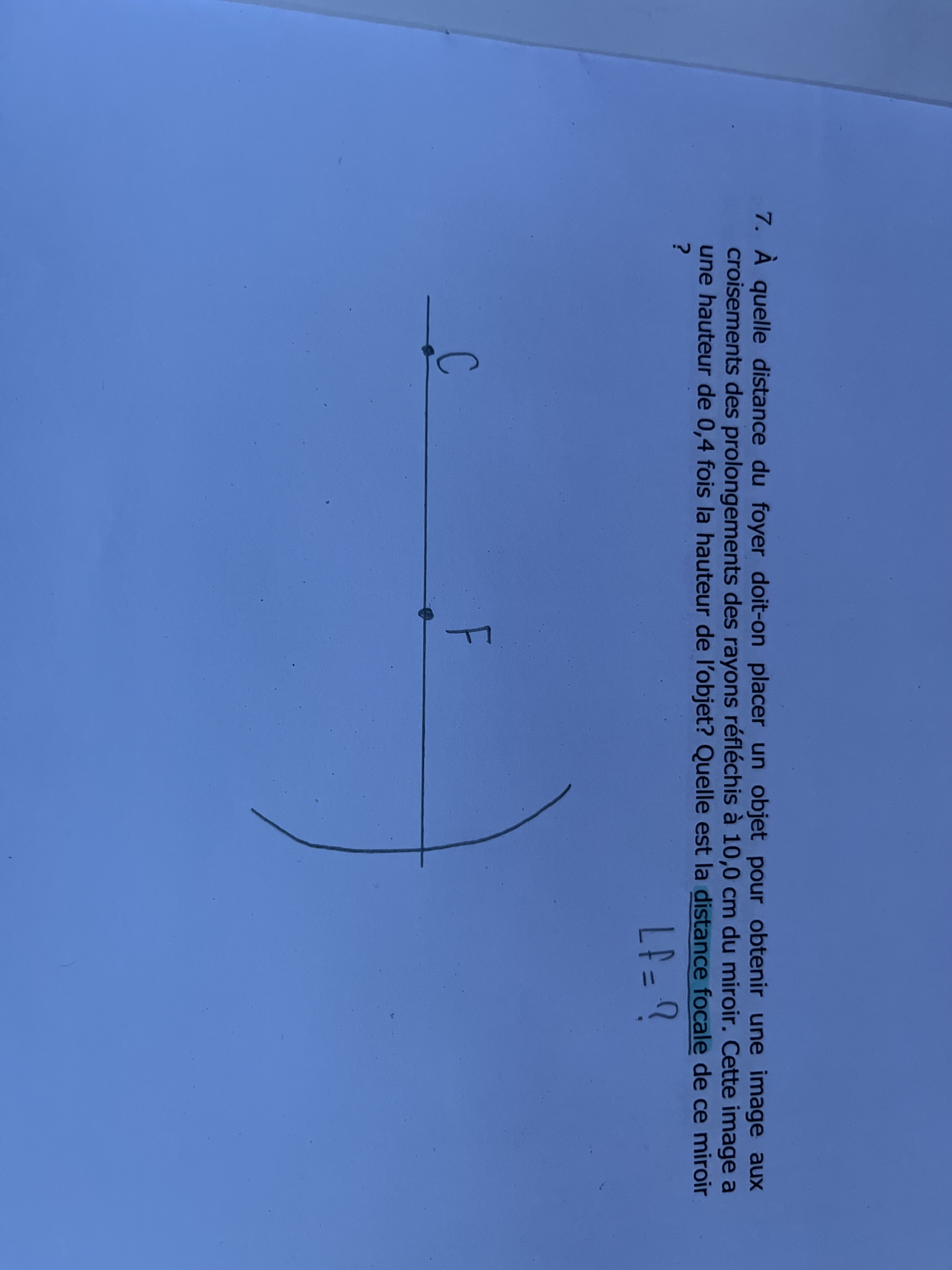 «Un élève calcul à l'aide de la formule de 1/f = 1/do + 1/di , la distance focale du miroir concave, et celui-ci obtient 74cm. Celui-ci a fait une erreur lors des calculs. Sans faire de calcul, pourquoi cette valeur est assurément fausse? »