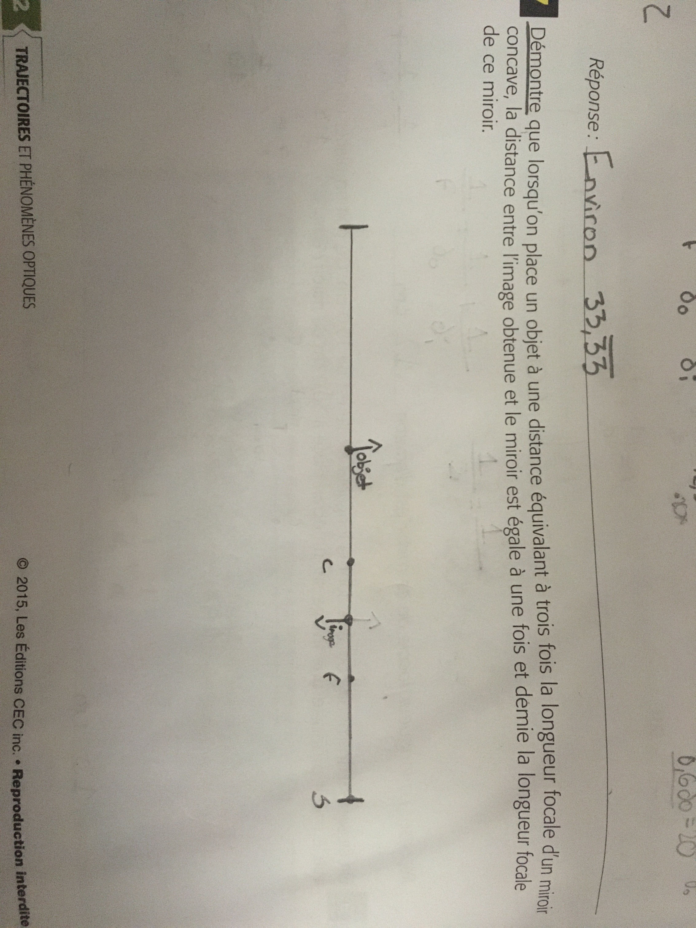 «Un élève calcul à l'aide de la formule de 1/f = 1/do + 1/di , la distance focale du miroir concave, et celui-ci obtient 74cm. Celui-ci a fait une erreur lors des calculs. Sans faire de calcul, pourquoi cette valeur est assurément fausse? »