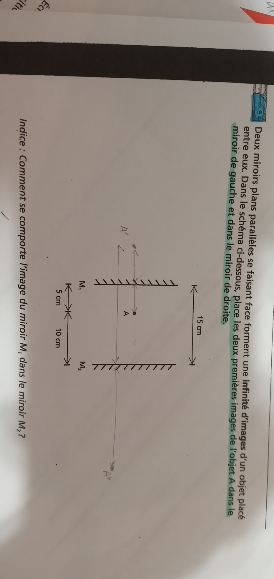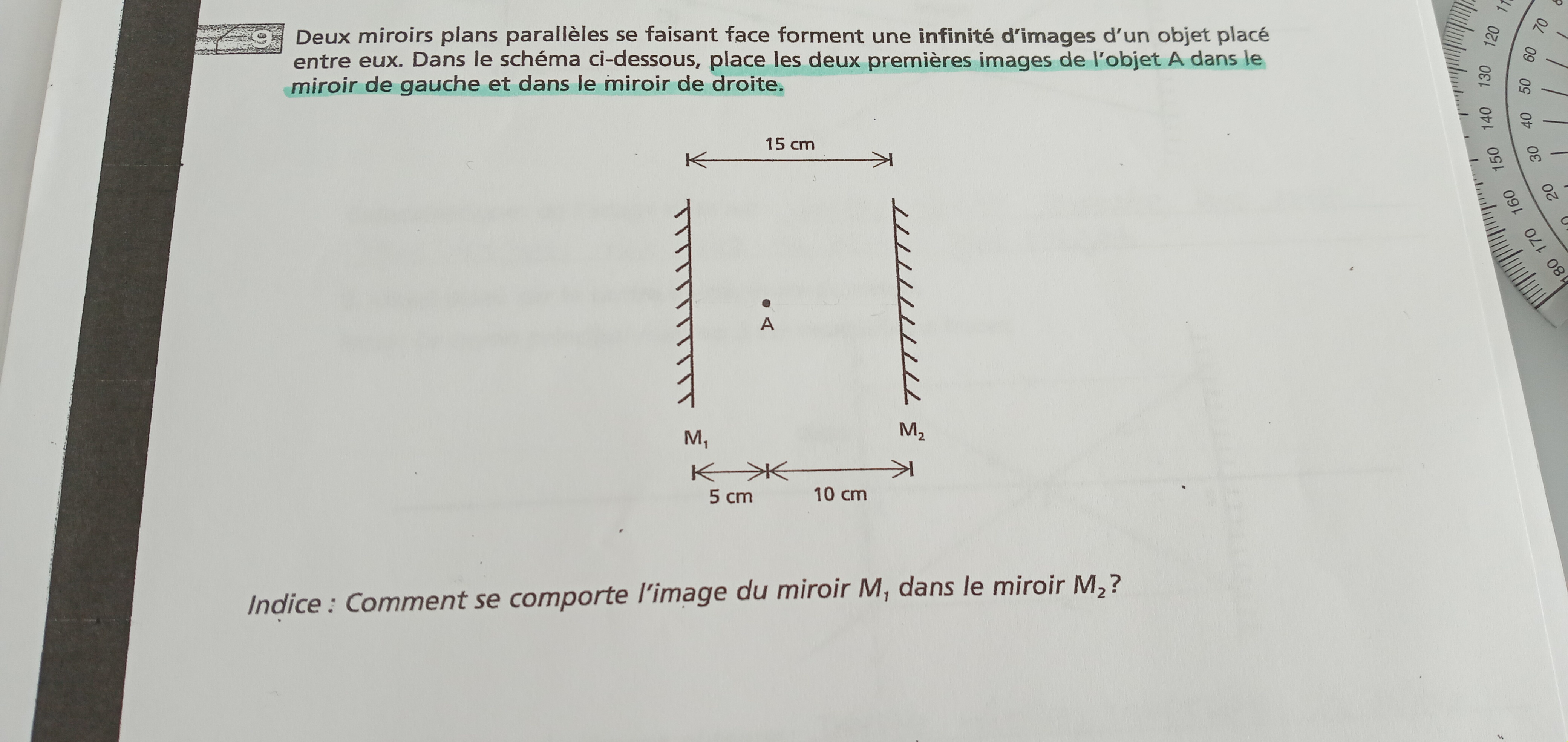 Secondaire 5 • 3aBonjour, j'ai 2 miroir plan, je cherche l'angle d'incidence du deuxième miroir plan a partir de l'angle de réflexion du premier miroir plan, quelle est la formule