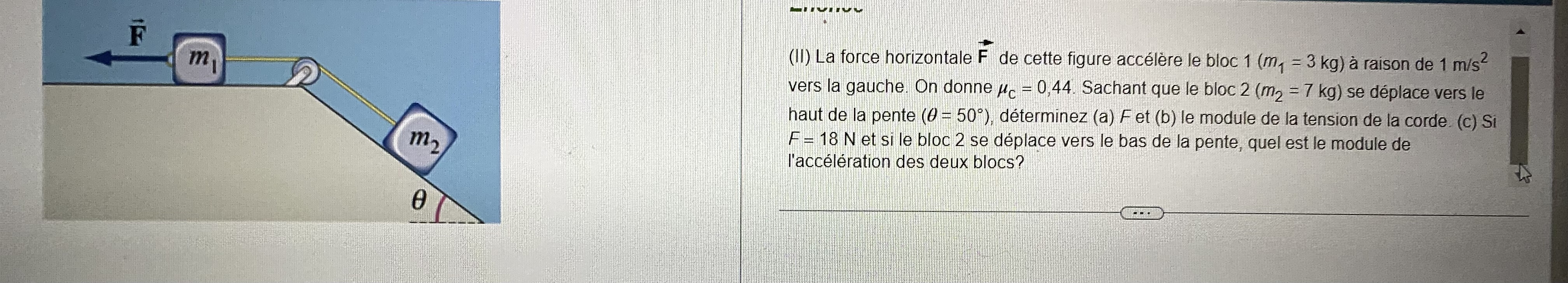 Postsecondaire • 3aLa force horizontale F de cette figure accélère le bloc 1 m/s au carré(m= 3 kg) à raison de 1 m/s? vers la gauche. On donne uc(coefficient du frottement cinétique) = 0,44. Sachant que le bloc 2 (m = 7 kg) se déplace vers le haut de la pente (angle = 50°), déterminez (a) F et (b) le module de la tension de la corde. (c) Si