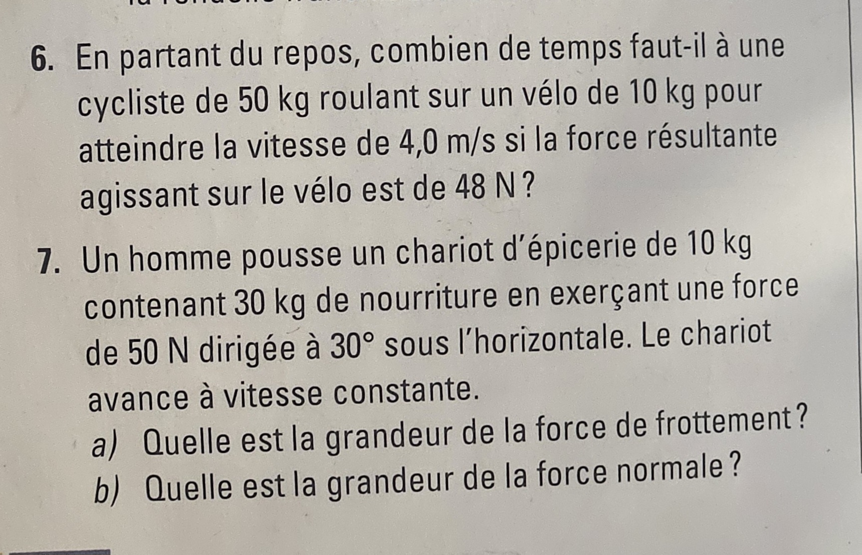 Secondaire 5 • 6mBonjour! En lien avec ceci:https://www.alloprof.qc.ca/zonedentraide/discussion/123838/questionmerci beaucoup pour l'explication! En soi, ce n'est pas la résolution qui me dérange, c'est plutôt que je ne comprend pas pourquoi (au numero 6) on considère le vélo et le cycliste comme un seul système alors que la question dit «la force agissant sur le vélo» et ne parle pas de cycliste. Pour la question 7, c'est la même chose, pourquoi le chariot + la nourriture?