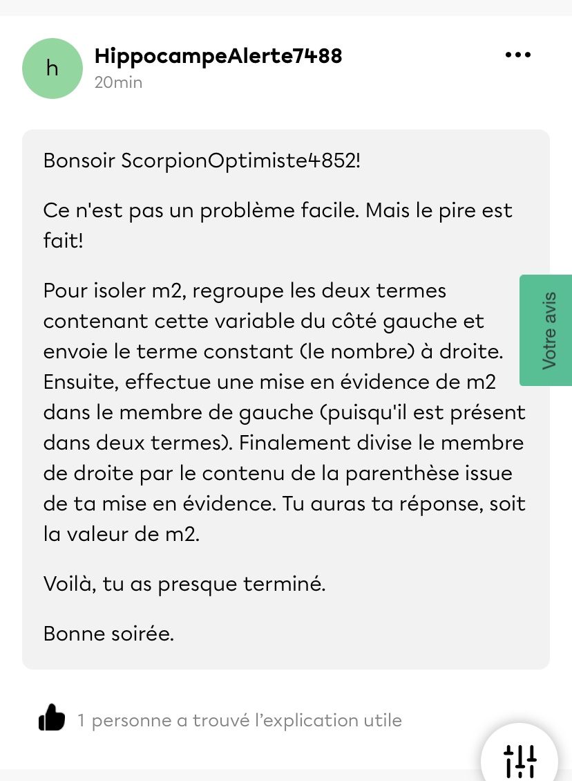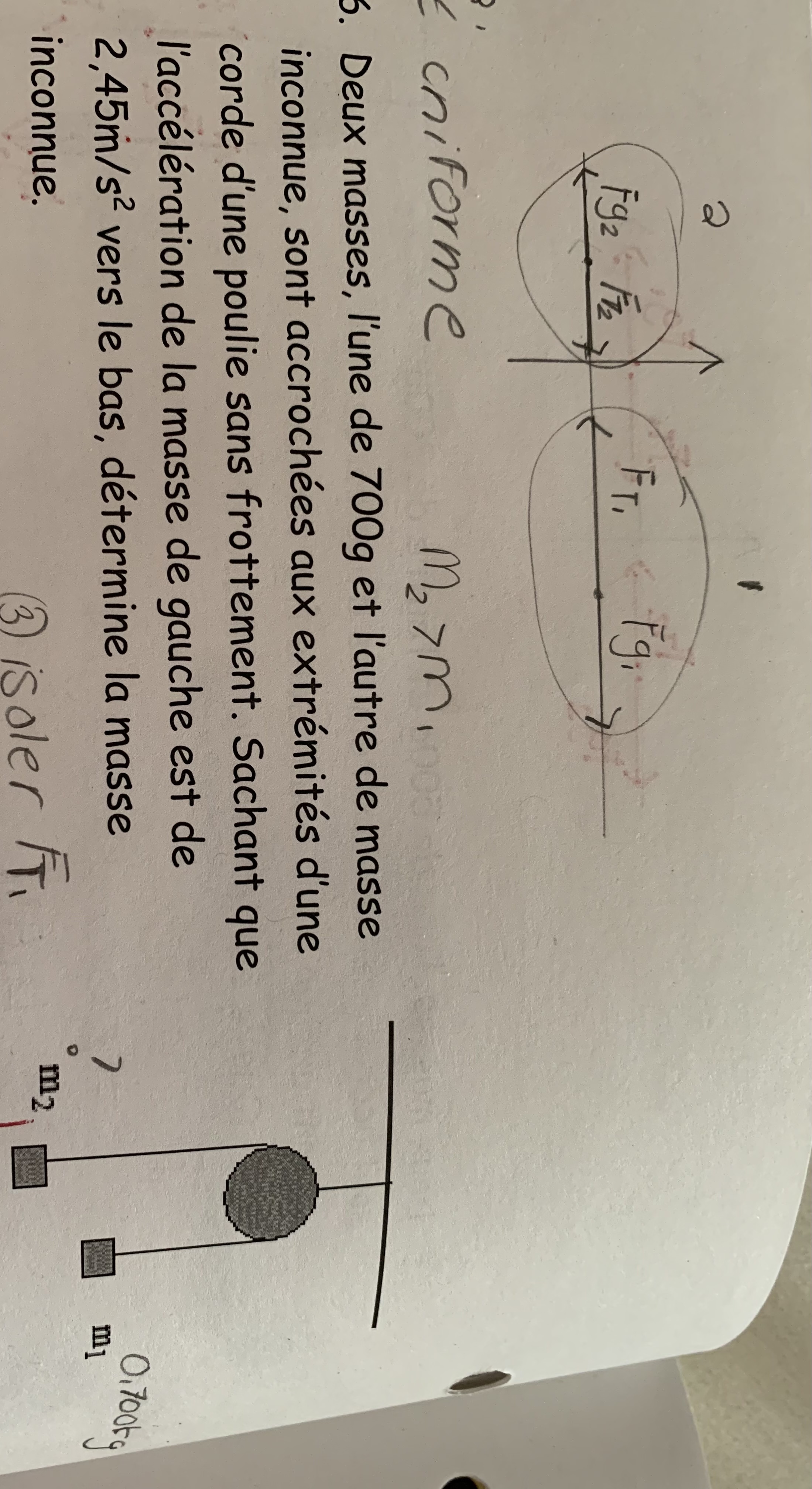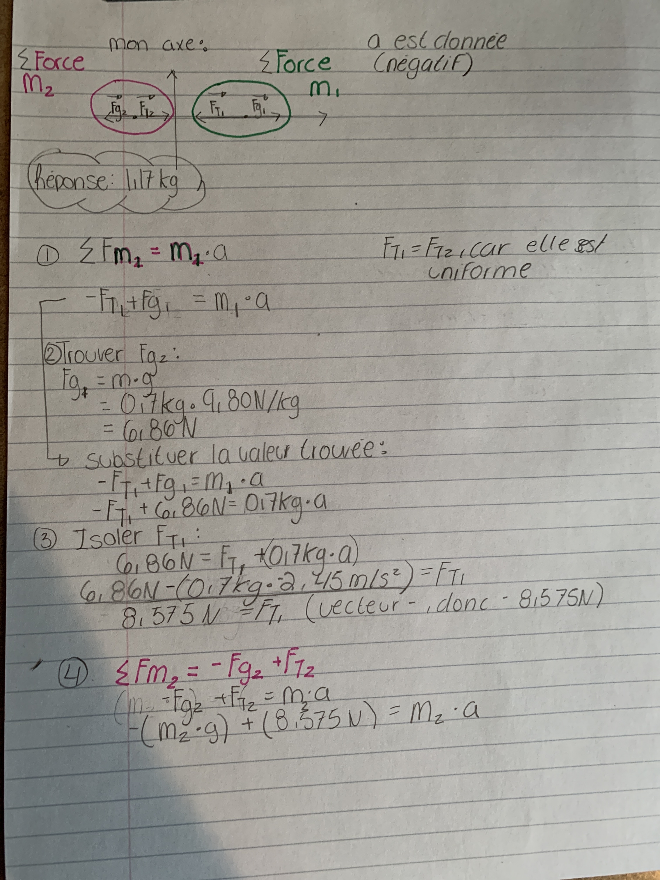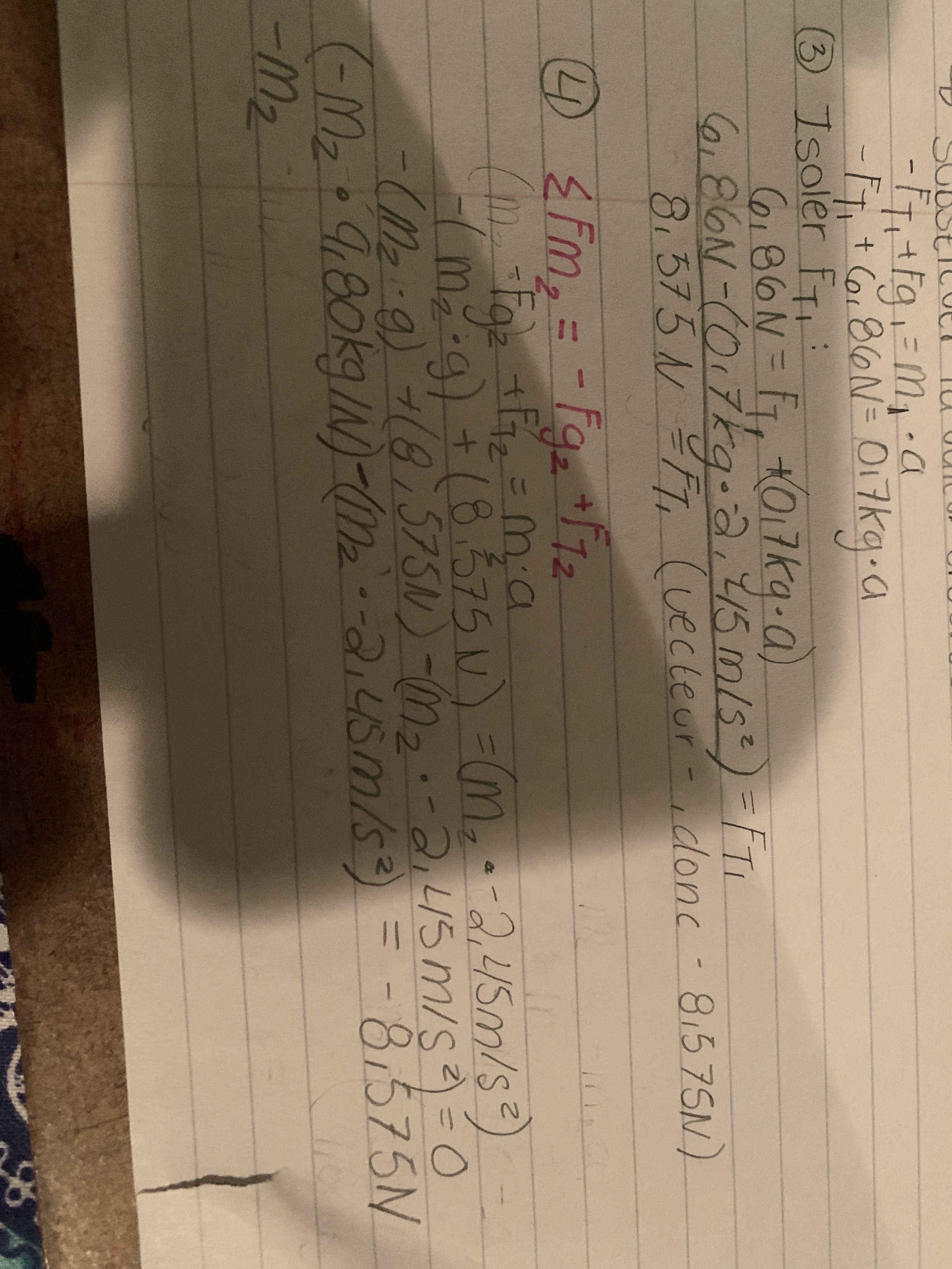 Secondaire 5 • 3aSalut , vous m’avez répondu , mais malheureusement j’ai pas envoyer mes démarches , enfaite vous avec calculer selon le système , moi j’ai divisé en partie , donc j’ai utilisé les force appliquer sur la masse 1 et l’autre de masse 2 , ainsi j’ai trouver les valeurs pour a la suite faire des substitution , mais ce que je ne comprend pas a la fin , est-il possible d’isolé le m2 ? Je ne sais pas comment , alors que j’ai trouver toute les valeurs , aussi , vous me dira si mes démarches font du sens , merci !