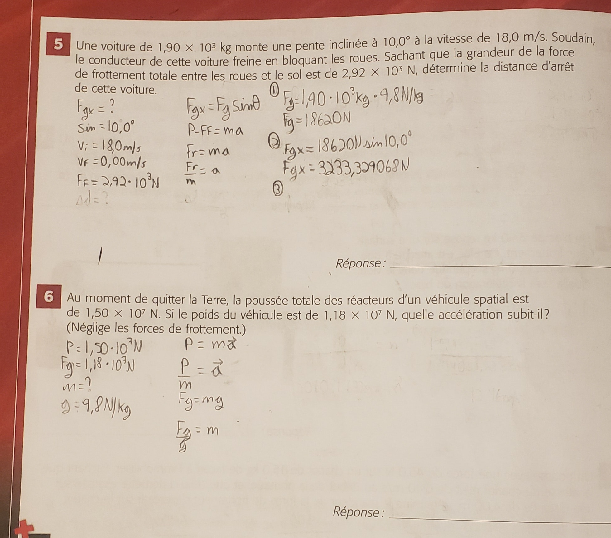 J'aimerais beaucoup avoir de l'aide sur le numéro 5 et 6 dans mon cahier de physique. C'est sur le diagramme de corp libre.Je sais qu'il faut utiliser la MRUA pour trouver la variation de distance, mais je ne sais pas quelle formule utiliser pour avoir un tel résultat. De plus, mon enseignant ne sais pas comment le faire elle-même alors j'ai besoin d'aide extérieur pour me débloquer.