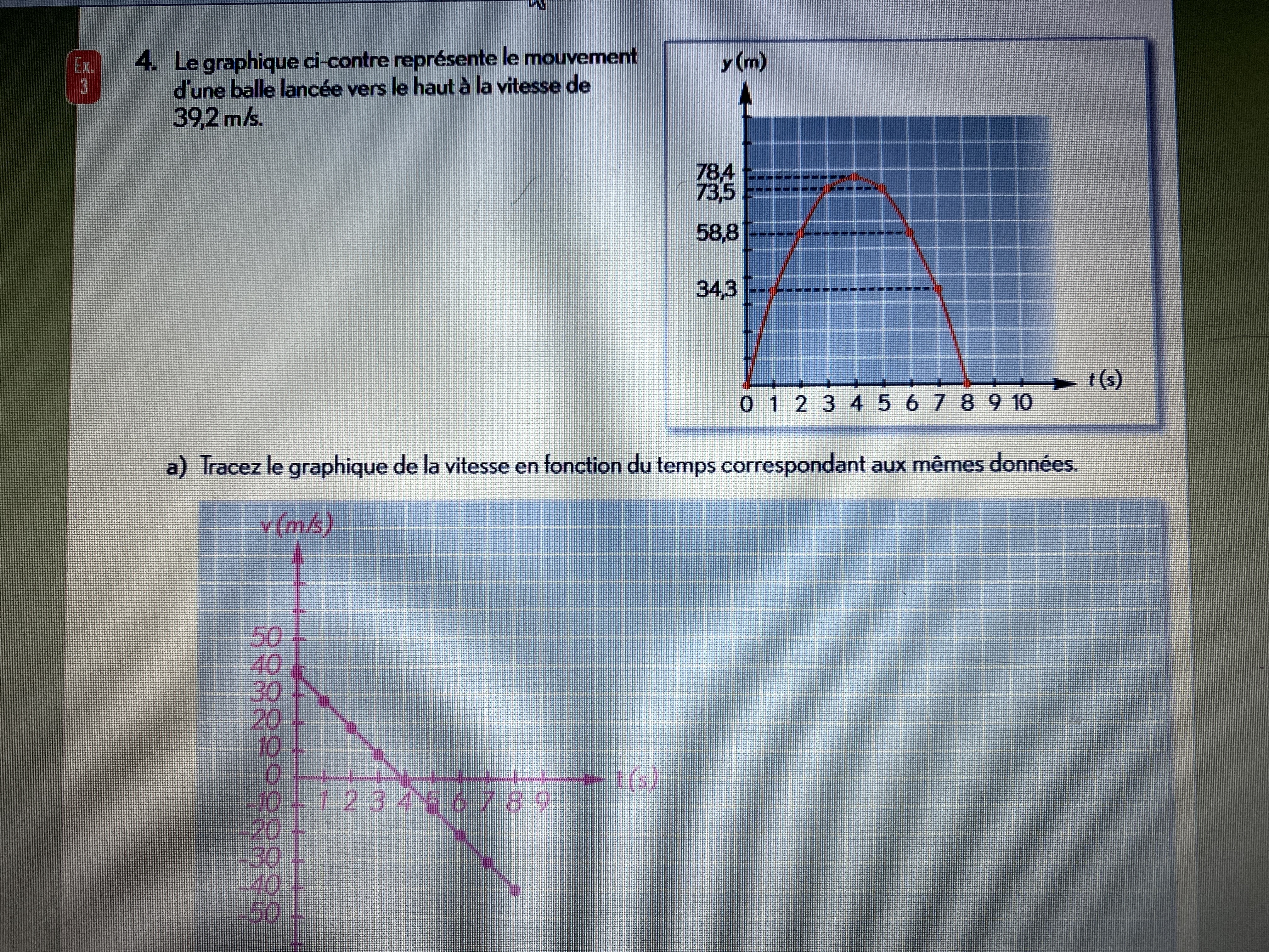 on me demande ici de tracer le graphique de la vitesse en fonction du temps. Il y a également le corrigé de l’exercice.Je ne comprends pas comment tracer ce graphique. Comment déterminer cette vitesse à chaque seconde? J’ai employé la formule de v=delta x / delta t, mais je n’obtiens pas la même réponse.