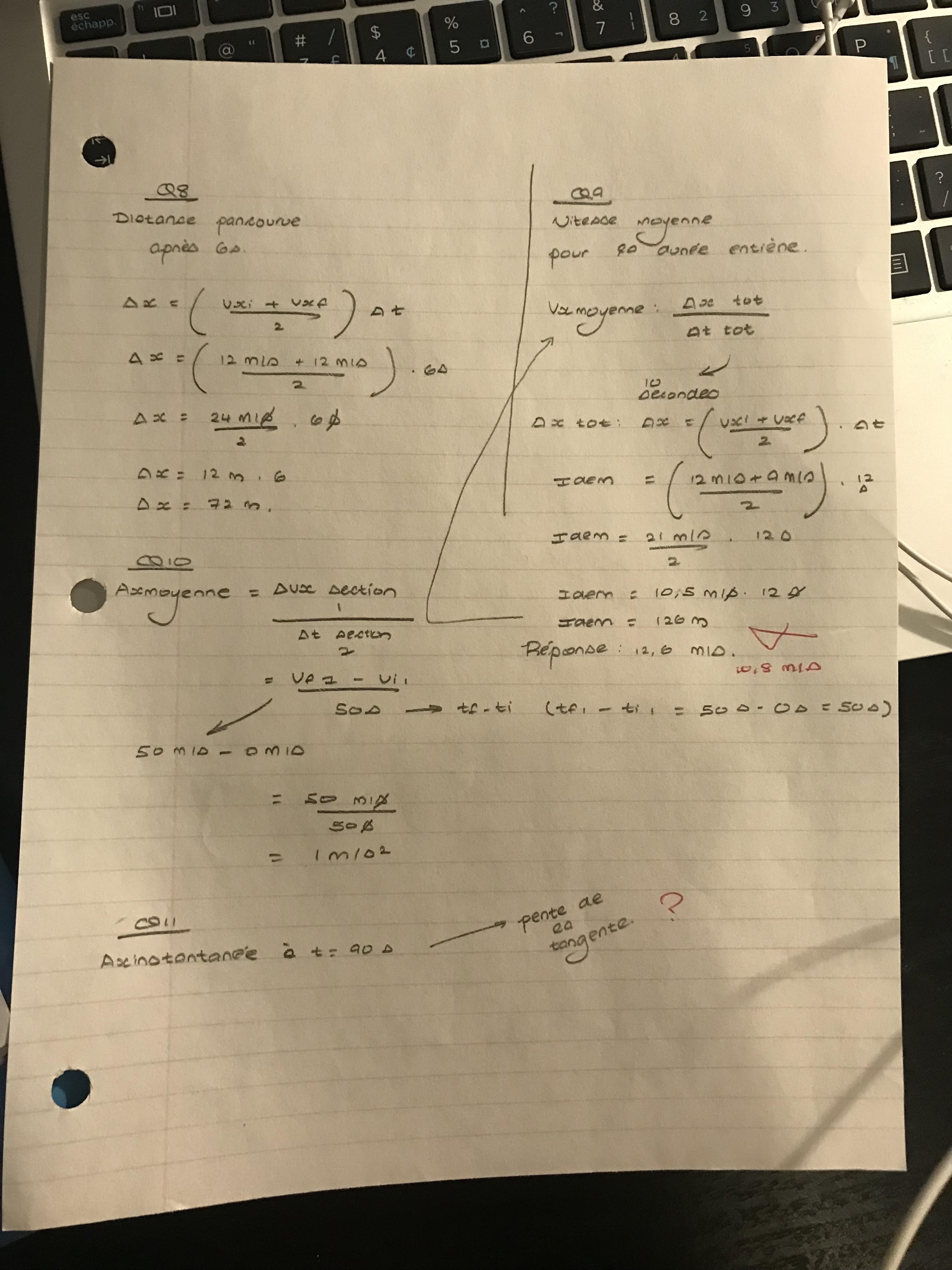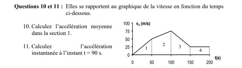 Que faire au numéro 11? (Je sais qu'on me demande une accélération instantanée à t = 90s ce qui veut dire que je dois la trouver par la pente de la tangente passant par les coordonnées (90s ; ? m/s).Avant tout, je dois tracer cette tangente...