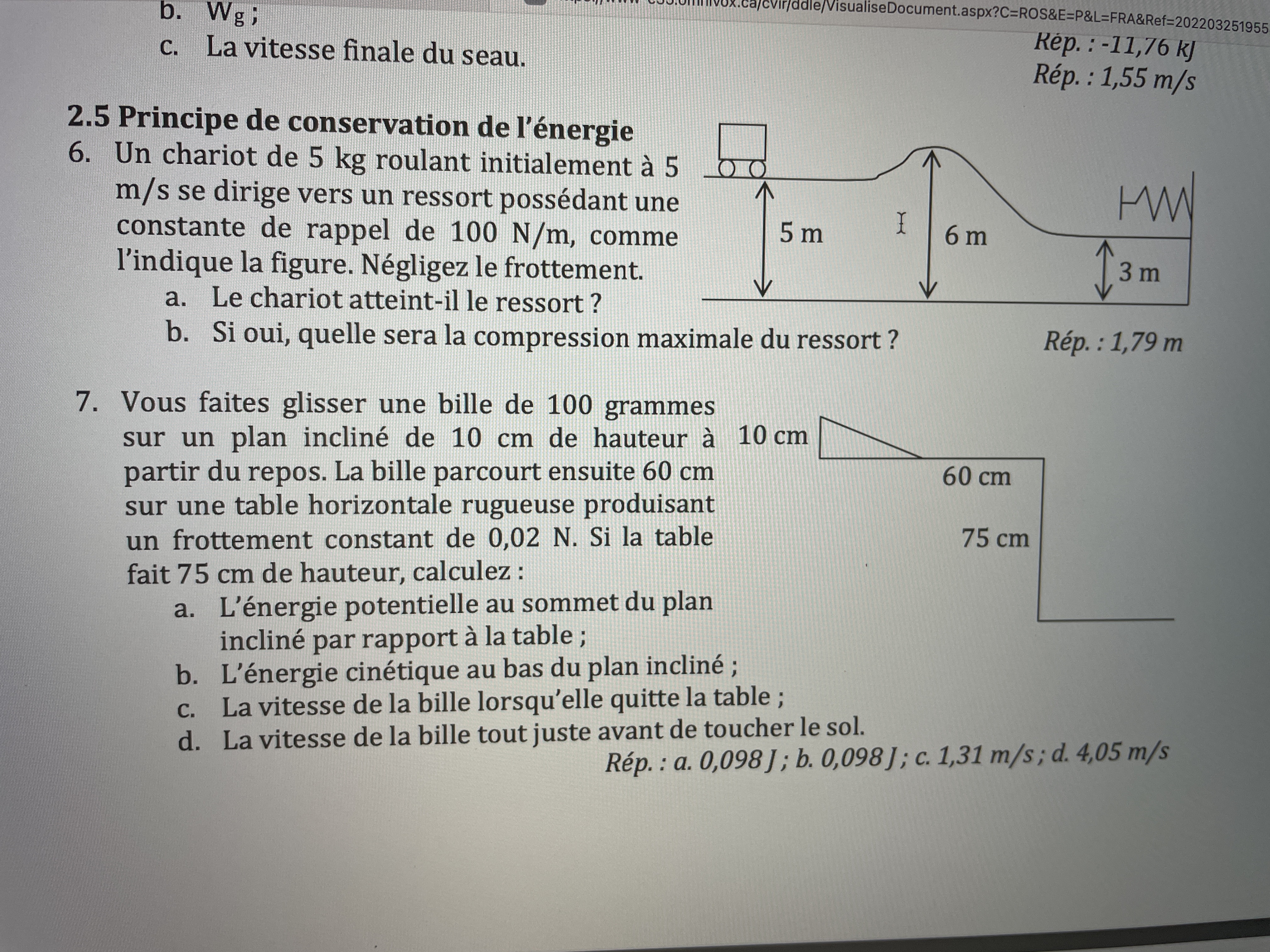 Secondaire 5 • 3aBonjour je comprend pas vraiment le concept de la conservation de l’énergie ? Pouvez vous me l’expliquer svp ?j’arrive pa a résoudre le problème 6 qui est en lien avec çamerci