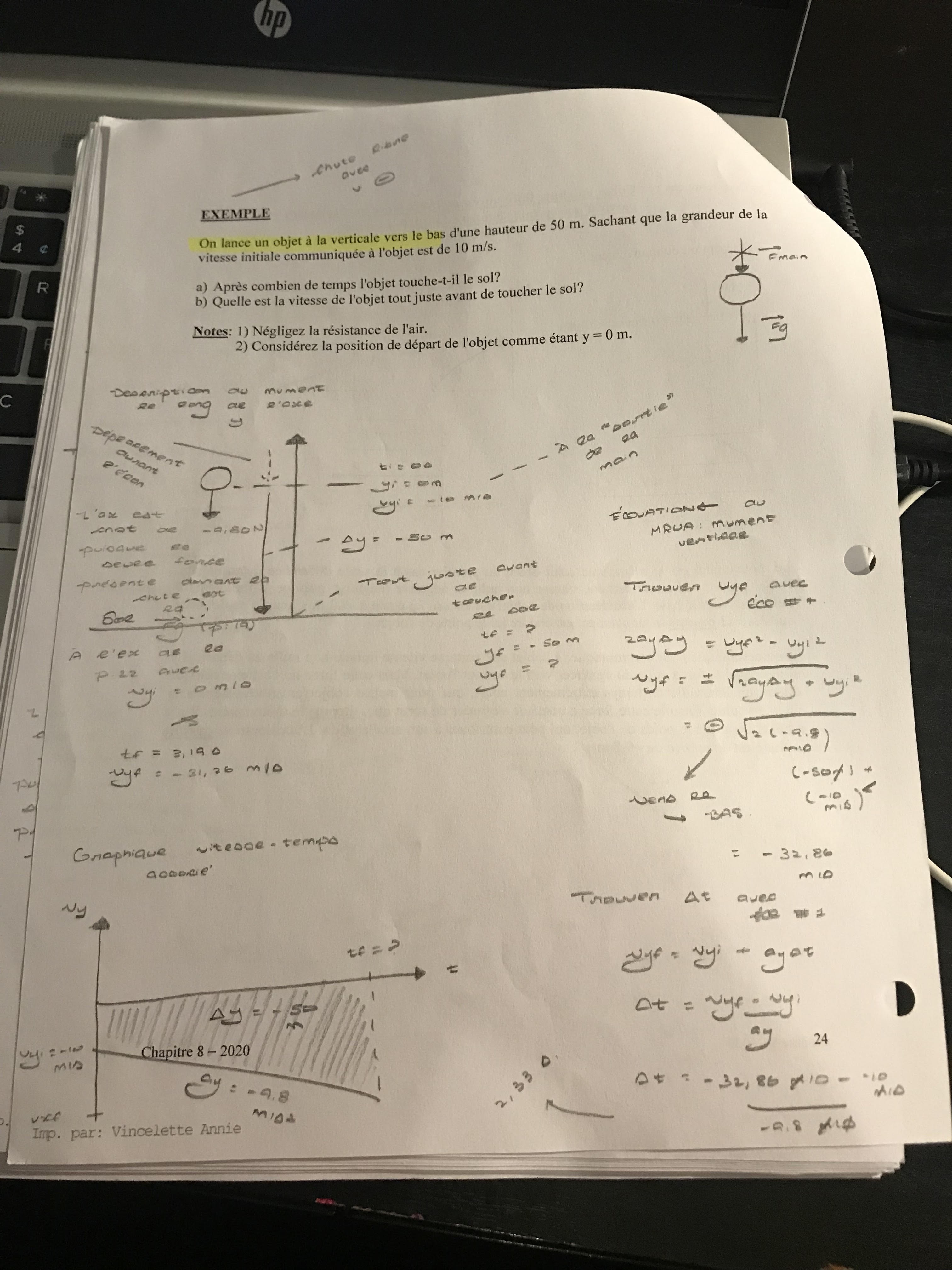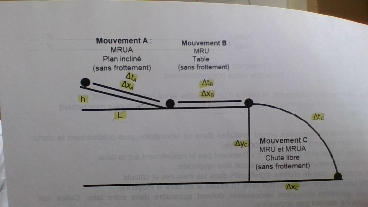 Secondaire 5 • 3aMise en situation: (la photo est prise de haut) Nous devons faire rouler notre bille sur cette planche, pour qu'elle roule ensuite sur la table et qu'elle parvienne dans le verre pour la suite. Le but: placé le verre à l'endroit exacte où tombera la bille. J'ai calculé la vitesse finale de la pente: qui devenait la vitesse initiale de la table. J'ai ajouté la vitesse initiale de la table à sa variation de vitesse pour obtenir la vitesse finale. Ainsi, je crois, avoir la vitesse avec laquelle je dois faire le calcul MRU de ma parabole. La hauteur de ma table est de 92cm et le temps que prend ma bille pour toucher le sol est de 0,116s, donc l'ensemble de l'expérience me dit que je dois placer mon verre à 0,7347m de la table. Problème: ma bille tombe exactement 20 cm plutôt. Voilà ma question: y-a-t'il une raison particulière que j'ai raté qui pousse ma bille à aller moins loin ou est-ce que j'ai complètement raté mes calculs?