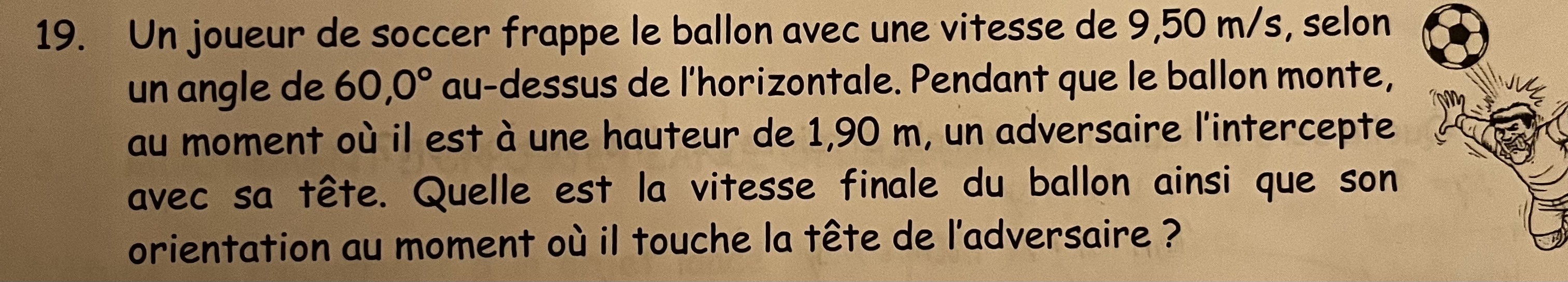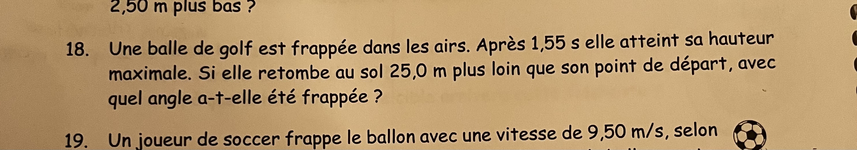 Secondaire 5 • 3aSalut j’aurais une question pour résoudre ce problème je sais pas comment m’y prendre ? La réponse c’est 7,28 m/s a 49 degrés