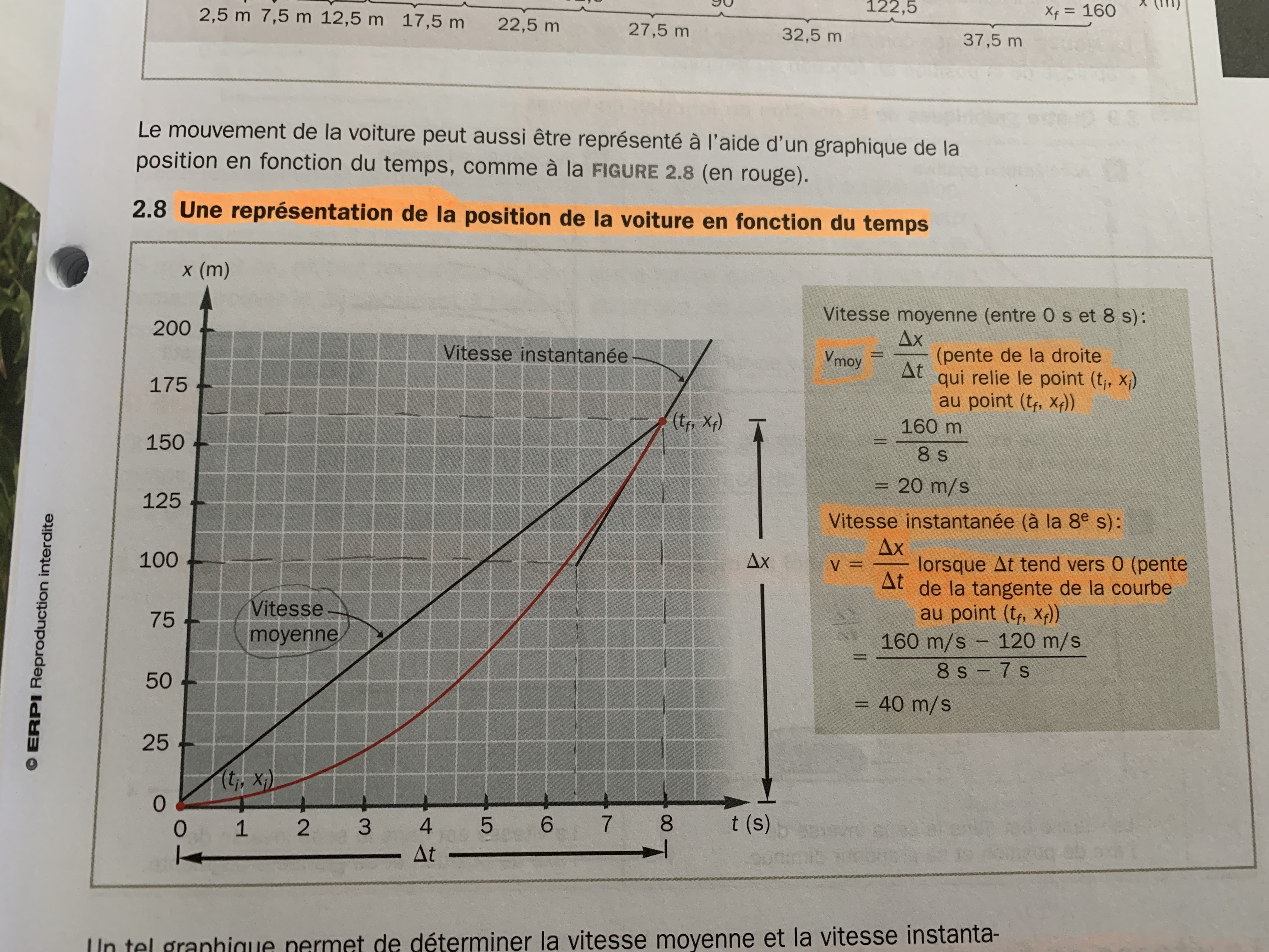Secondaire 5 • 3aBonjour,je comprends pas comment la vitesse instantanée est 40 m/s ici,les coordonées de 8e seconde n'est pas de (8;162,5)?Pourquoi il utilise (8,160)??et comment il sait à la 7e seconde,la vitesse est de 120m/s??