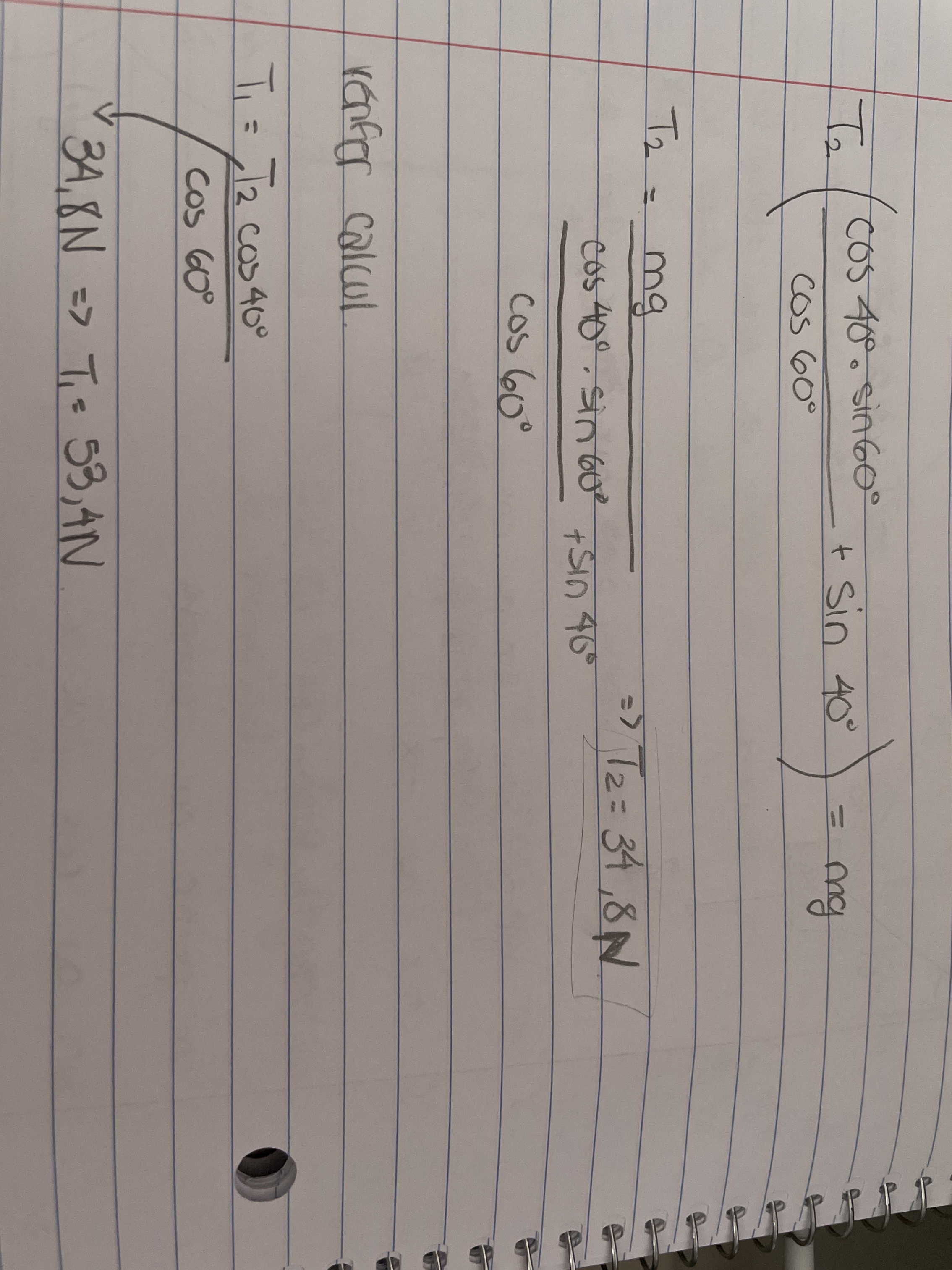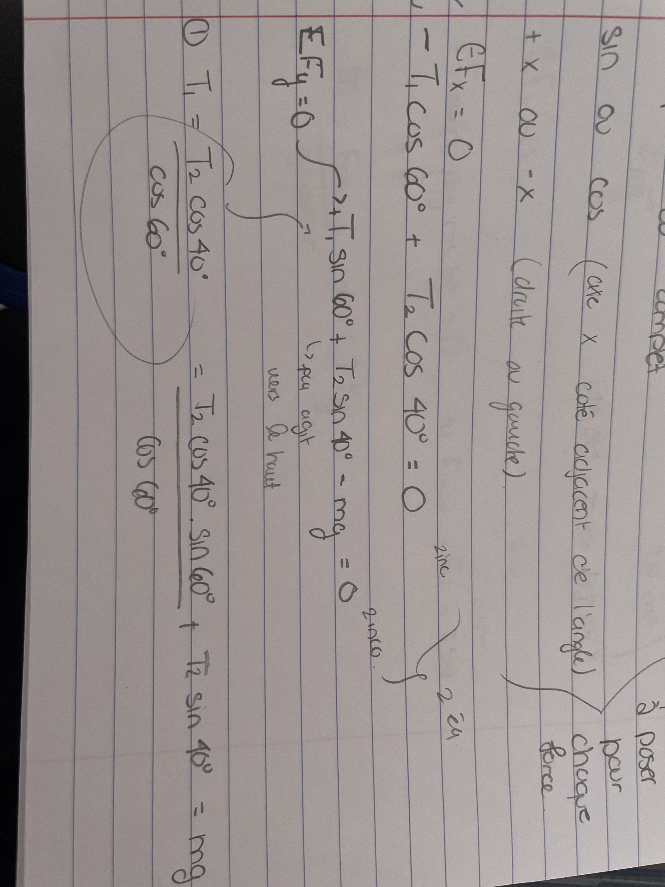 Secondaire 5 • 3aBonjour , pour la question 7 lorsqu’on veut utilisé la formule la somme des forces = 0 comment je vais faire pour savoir si elle est positive ou négative, j’ai pas compris pourquoi lorsque c’est le cos t1 est negative et avec le sin c’est positive, pouvez vous m’expliquer cela svp ?
