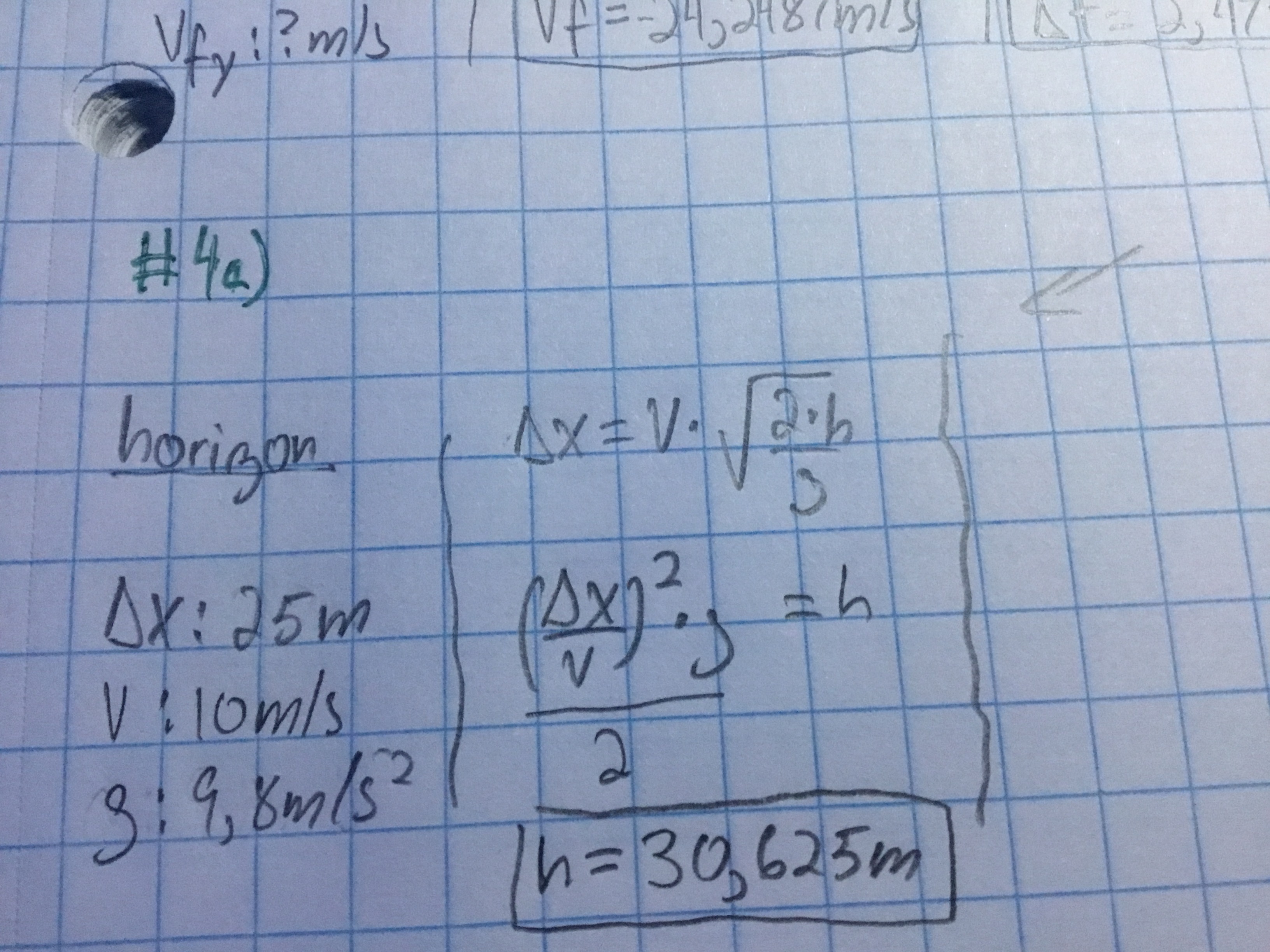 Je pense que j’ai réussi à trouvé la hauteur de l’édifice mais je ne sais pas comment trouver la grandeur et l’orientation de la vitesse finale. Habituellement, pour trouver la grandeur et l’orientation d’un projectile lancé obliquement, on décompose le mouvement en 2 vecteurs. Mais comment on fait pour un projectile lancé horizontalement (à 0º)??