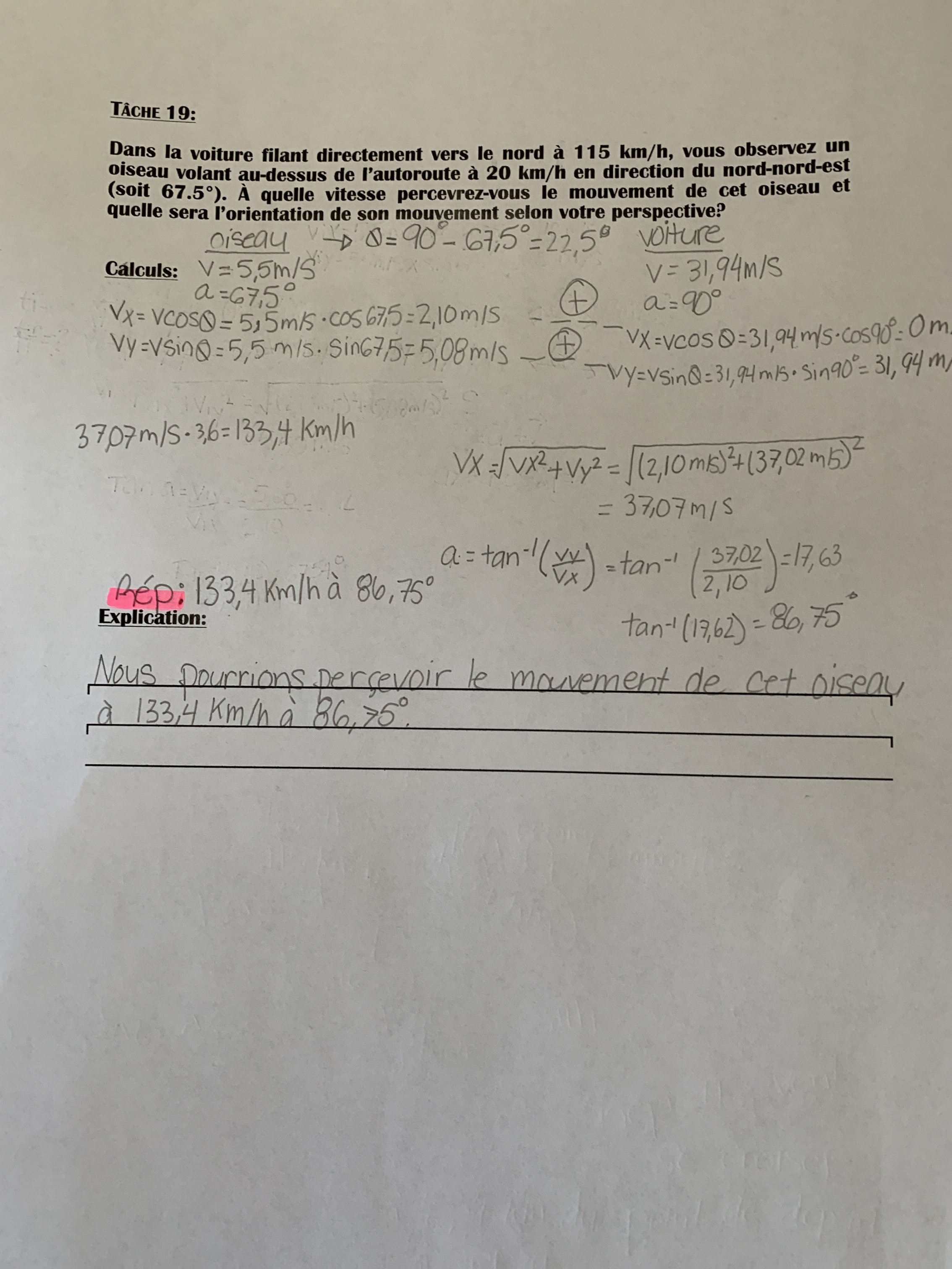 Dans ce numéro on me dit que l’oiseau se déplace en direction du nord-est à 67.5 degré, dois-je utiliser la méthode de l’angle trigonométrique et le soustraire à 90 degré?