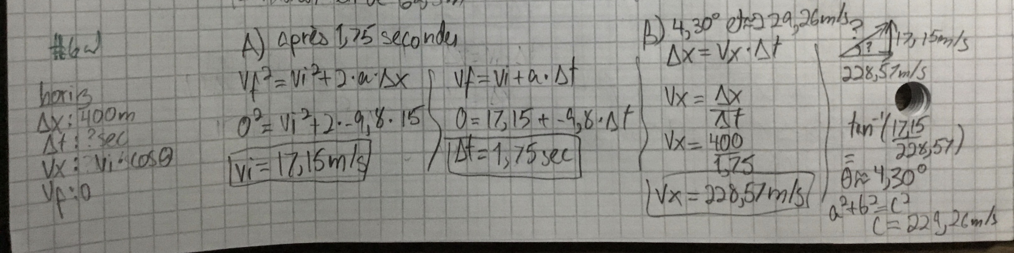 Je pense qu’il faut former un triangle rectangle de 15m de hauteur et 200m de long puis trouver l’angle et une fois que j’ai mon angle je peut isoler le temps dans l’équation horizontale pour ensuite placer cette équation dans l’équation complète verticale. C’est juste que je ne pense pas qu’il faut faire un triangle rectangle parce que c’est un cercle donc ça fonctionne pas. Suggestions?
