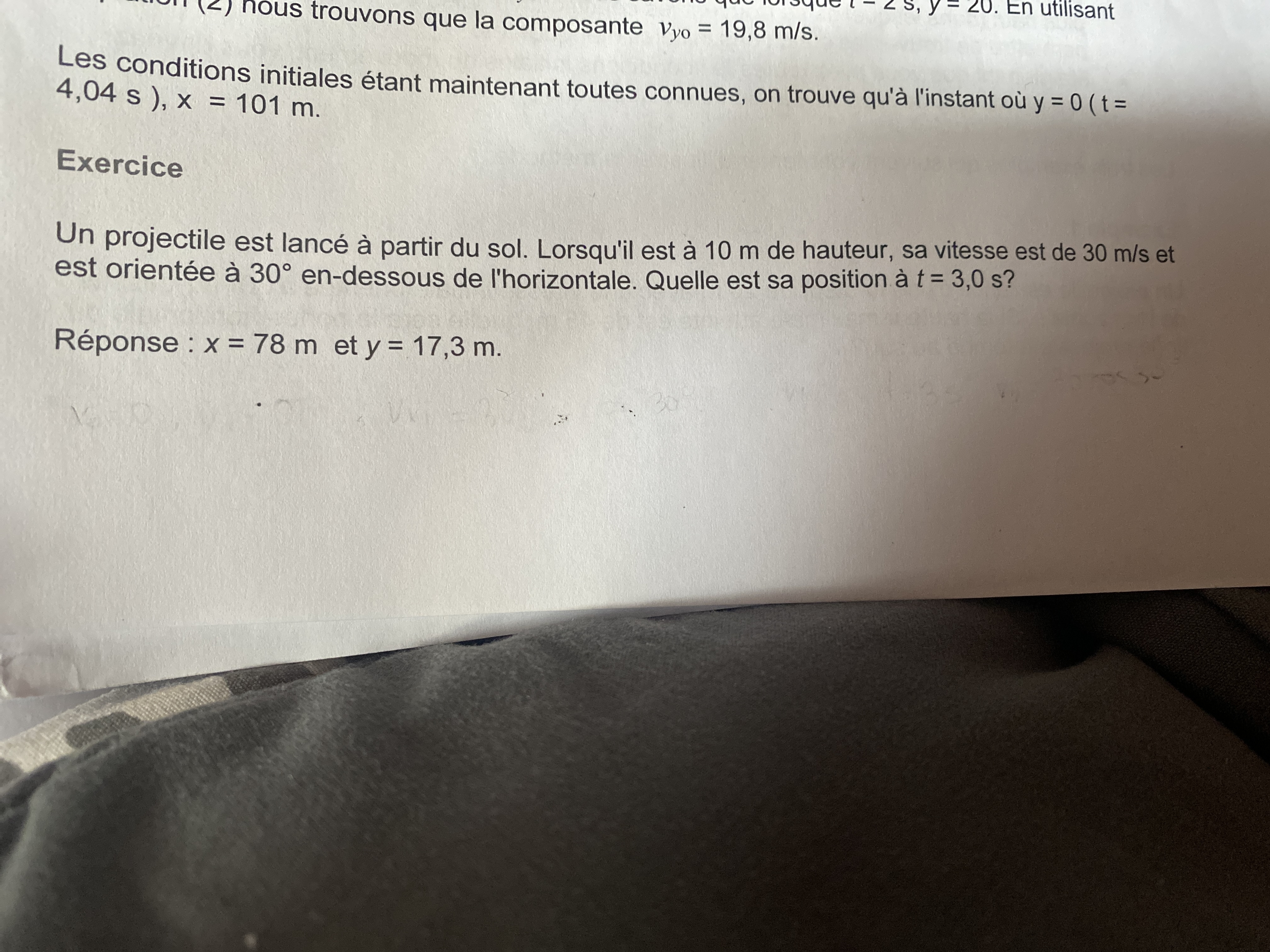 B) Quels étaient la vitesse initiale et l’orientation du projectile?