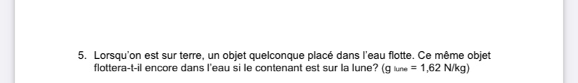 Secondaire 5 • 3aMon hypothèse c’est que l’objet flotte encore dans l’eau, car puisque nous avons changer la force gravitationnelle pour celle de la lune, le force gravitationnelle a diminué mais la poussée d’Archimède aussi donc sa revient au même.
