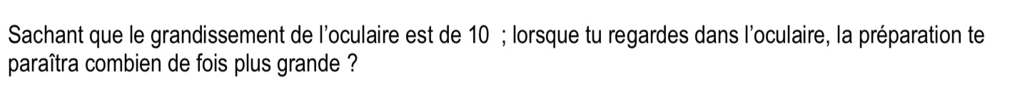 De plus, il faut calculer le grandissement totale du microscope. Pour y arriver il faut multiplier le grandissement des deux lentilles. Il est mentionné dans le texte que le grandissement de l’oculaire est de 10 donc Grandissement totale = Grandissement objectif x 10. Ma question est la suivante: Puisque l’image formée par l’oculaire est virtuelle cela voudrait dire que Hi est négatif( nous utilisons une autre convention de signe) donc le grandissement devrait être de -10. Dois-je multiplier le grandissement de l’objectif par -10 ou par 10 pour obtenir le grandissement totale?Merci en avance