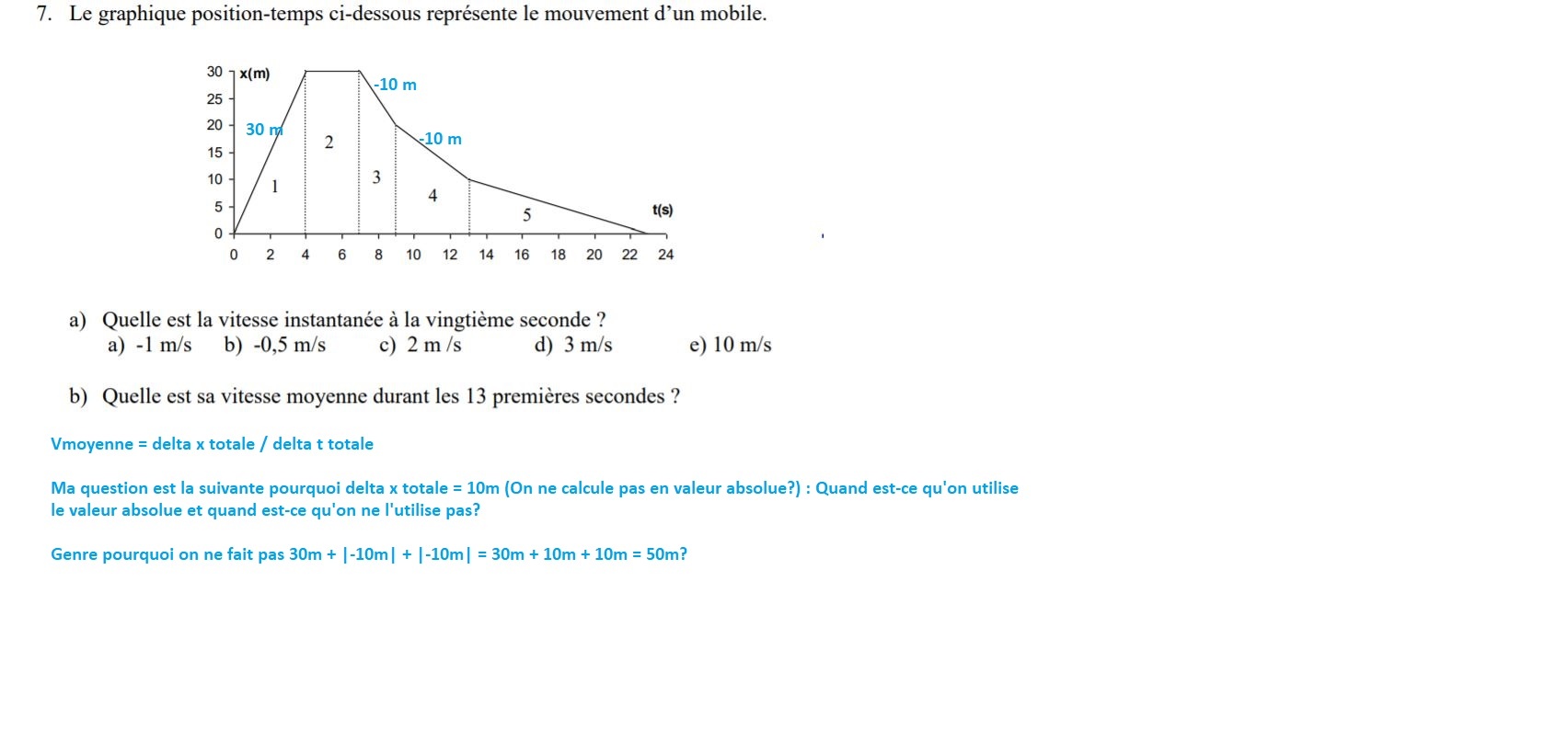 J'aurais une question concernant cet exercice. (J'ai écris ma question sur l'image / exercice.)Est-ce que dans notre cas, pour le calcul du delta x totale, on ne met pas de valeurs absolues, car cette dernière représente le déplacement et un déplacement est vectorielle. (Il peut s'effectuer soit vers la gauche ou soit vers la droite.)