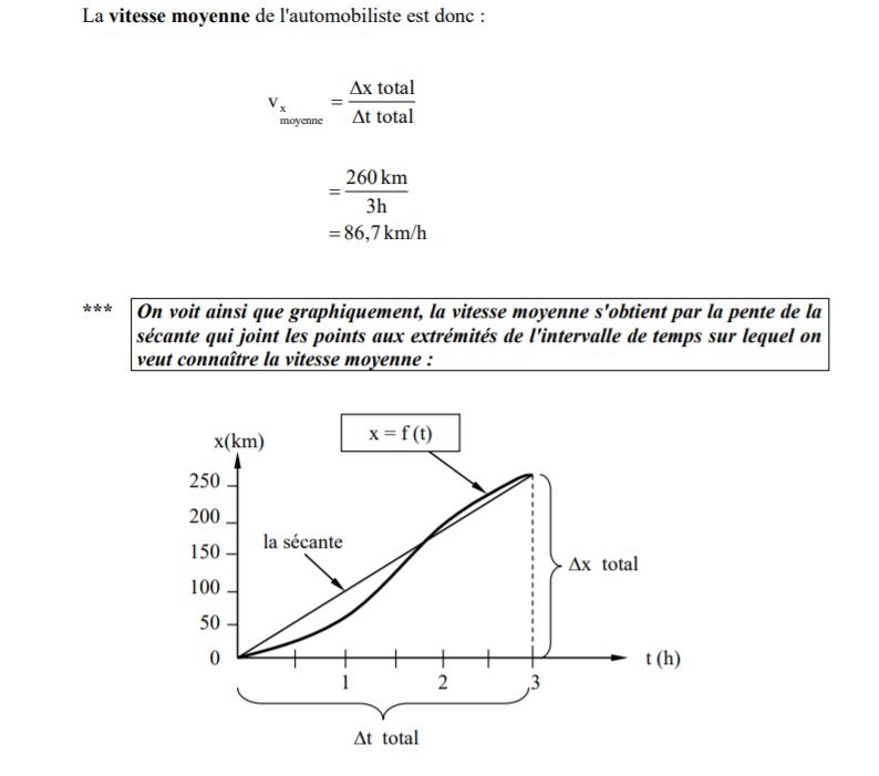 Formule : Vitesse moyenne = delta x tot / delta t tot.