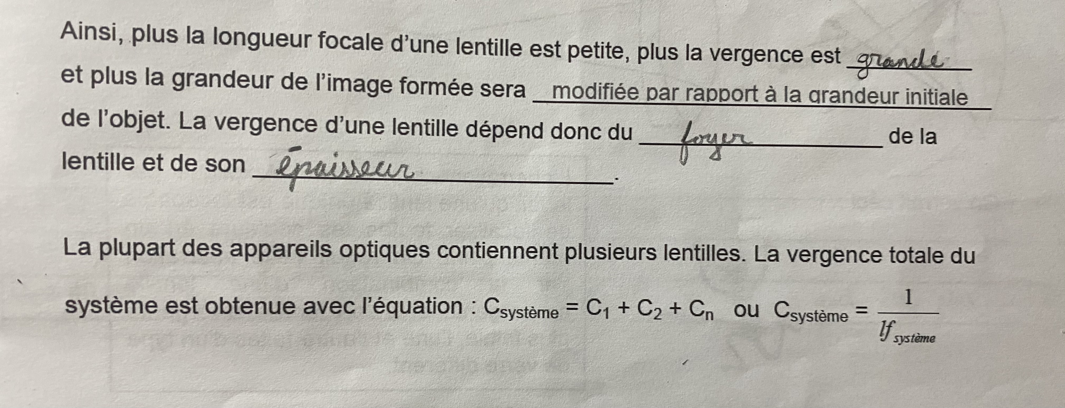 Si nous souhaitons avoir le grandissement le plus élevé d’un objet, faudrait-il prendre une lentille avec une grande vergence ou petite vergence. Selon moi sa serait elle avec la plus grande vergence, mais je ne suis pas certain a 100%.