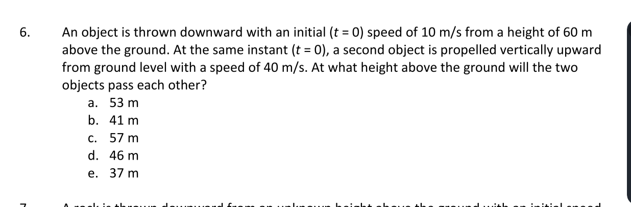 Secondaire 5 • 3aMes salutations, quelqu'un pourrait-il me venir en aide sur l'exercise suivant ? Veuillez excuser le fait qu'il soit en anglais. Soit dit en passant, la réponse à l'exercise suivant est la lettre B). Or, je ne suis point capable d'en trouver le raisonnement mathématique. En passant, la matière étudié en ce moment est la chute libre, l'accélération et la vitesse. La question est la suivante: Un objet est lancé verticalement vers le bas à 10m/s sur une hauteur de 60 mètres au dessus du sol. Au même moment, un second objet est propulsé verticalement vers le haut avec une vitesse initiale de 40m/s. À quelle hauteur au dessus du sol les deux objets se rencontreront ? Merci infiniment d'avance