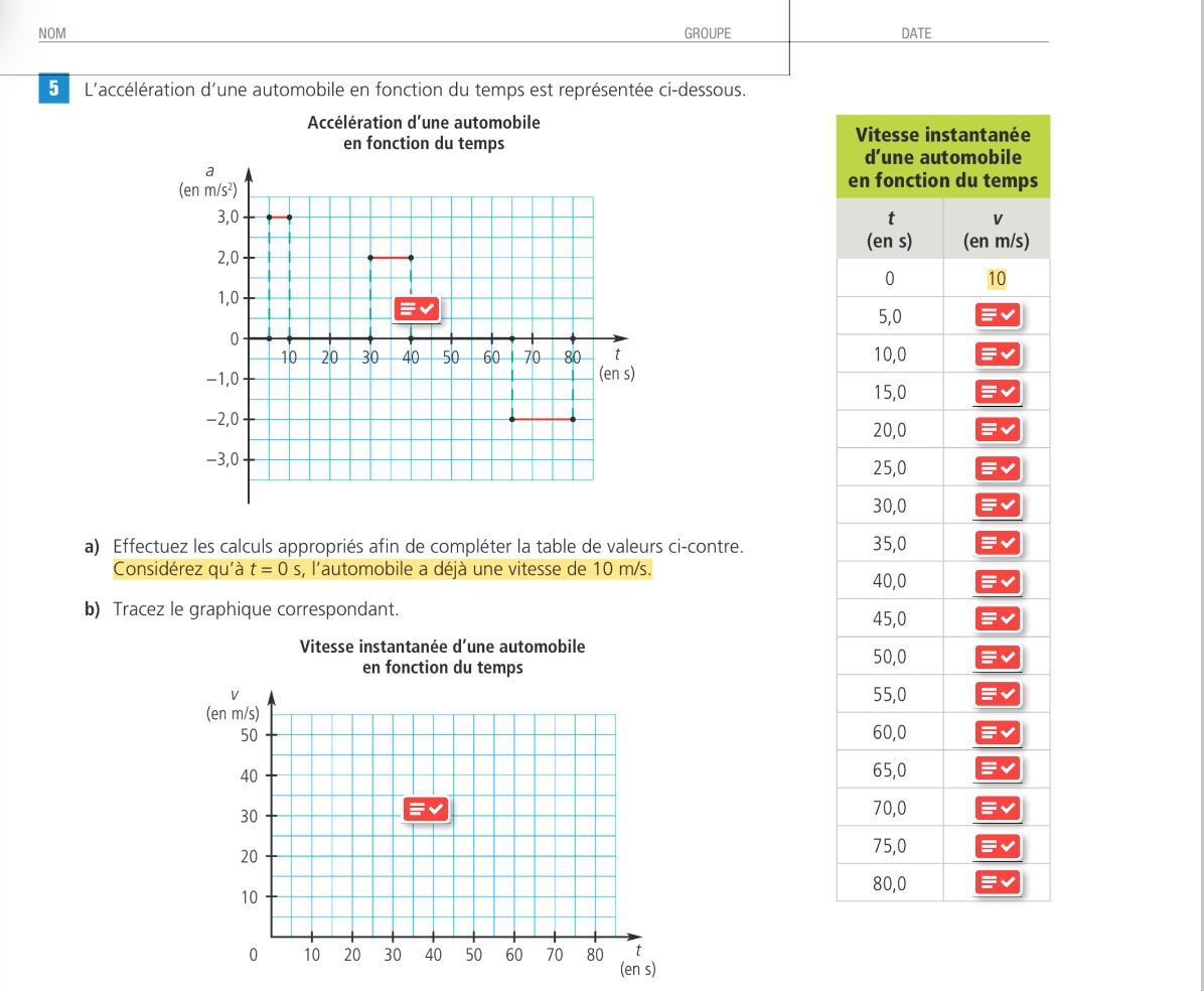 Secondaire 5 • 9mBonsoir, j’ai poser une question plus tôt pendant la soirée et avec la réponse, j’ai compris à moitié. C’est juste que dans le problème, je comprends que lorsque l’accélération est nulle, la vitesse reste la même, par exemple, pour 5s, la vitesse reste à 10 m/s. Par contre je comprends pas comment calculer le 10s lorsque j’ai juste l’accélération et le temps. Je sais qu’il faut utiliser la formule à = variation vitesse / variation temps, mais dans ce cas, je suis pas trop sûre de comment l’utiliser. merci beaucoup!