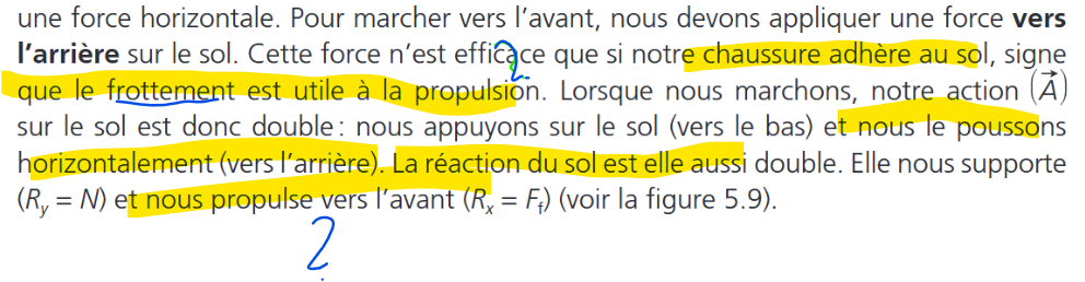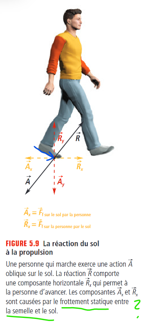 1) Lorsqu'unbus s'accélère/ se met en marche,pourquoiest-ce que les passagers sontprojettésversl'arrière, alors que lorsque lebus décélère/ralentit,les passagers sontpropulsés vers l'avant?Pourquoi est-ce que dans chacun des cas,les passagers ne suivent pas le mouvement du bus et vont dans le sens opposé? Svp expliquez-moi ça en détails :_(2) Cet exemple concernant la loi d'action-réaction implique le cas de la propulsion quand on marche me mélange. En fait, dans l'image ci-contre, je n'arrive pas à capterpourquoi le vecteur Action (représenté par une flèche noire dans le troisième quadrant) est incliné et n'est pas représenté comme la ligne en bleu.Voici un extrait qui me mêle (toujours dans le même scénario):Aussi,comment est-ce que le frottement aide à la propulsion?En fait, si la force de propulsion implique la force de frottement,alors ne devrait-il pas plutôt nuire à la propulsion, car la friction s'oppose au mouvement?SVP j'ai vraiment besoin de vos explications,j'ai tout consulté,maisje n'arrive pas à comprendre ces cas spécifiques.Merci beaucoup :D