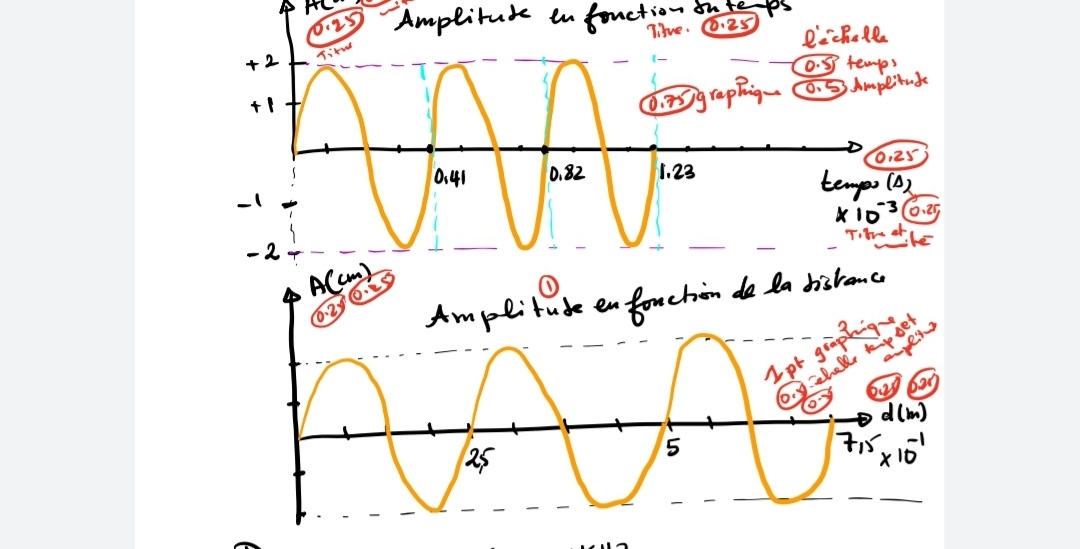 Par rapport à ma question sur les ondes. Dans ce cas là en ayant seulement la longueur d'onde, la fréquence, la vitesse comment fait on pour tracer une onde sur le temps et l'autre sur la distance avec les mêmes informations ? Aussi pourquoi dans le graphique sur la distance un cycle n'est pas égale à la longueur d'onde (5-2.5= 2.5 alors que la longueur d'onde est de 0.25)?