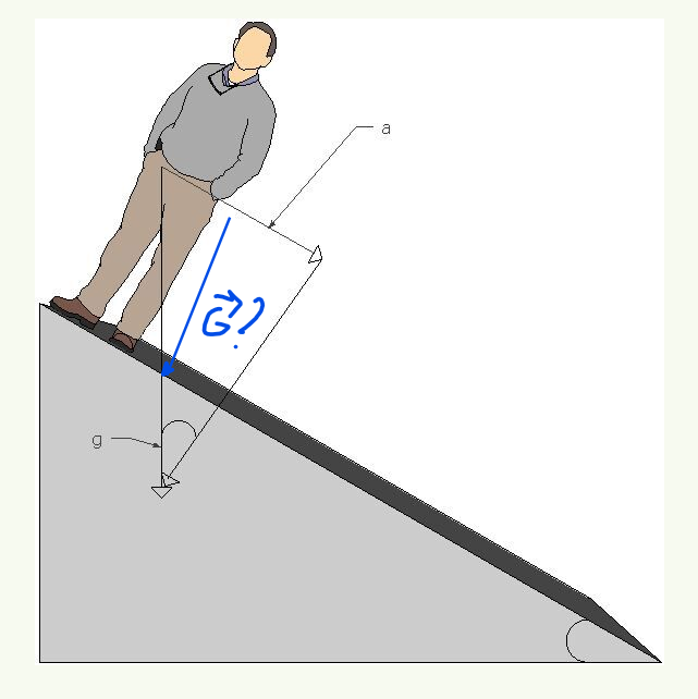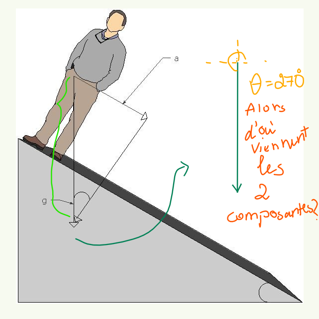 1) Je ne comprends paspourquoi la force de gravité est verticale, alors que la force normale est perpendiculaire, car si on pose l'objet sur une surface, elle exercera le poids selon l'angle auquel il est placé... Dans l'image inséré en bas, pourquoi la force de gravité n'est pas placée comme la flèche bleue?2) Dans les dessins du fiche alloprof et même dans mon cahier de physique,la force de gravité est représentée par une flèche verticale qui pointe vers le bas et on dit qu'il a deux composantes (en x = l'accélération et en y = la force normale).Cependant, ce qui me mélange beaucoup c'est que si mon vecteur de force de gravité est tout droit, alors comment ça se fait qu'il a deux composantes, alors que les vecteurs qui sont verticales à un angle de 270 degrés ont juste une composante en y...3) Je comprends comment dessiner un diagramme à corps libre.Or, quand il s'agit du mouvement d'un objet sur le plan incliné, je ne comprends pas comment placer ma force normale, comment placer l'angle et bien mettre toutes les forces pour qu'ils passent par le point (le corps).Est-ce que svp svp mefaire un dessin d'un diagramme avec des données fictives...Svp j'ai consulté toutes vos sites, mais j'ai vraiment besoin des réponses personalisées à mes doutes.Svp svp svp à l'aide :_(