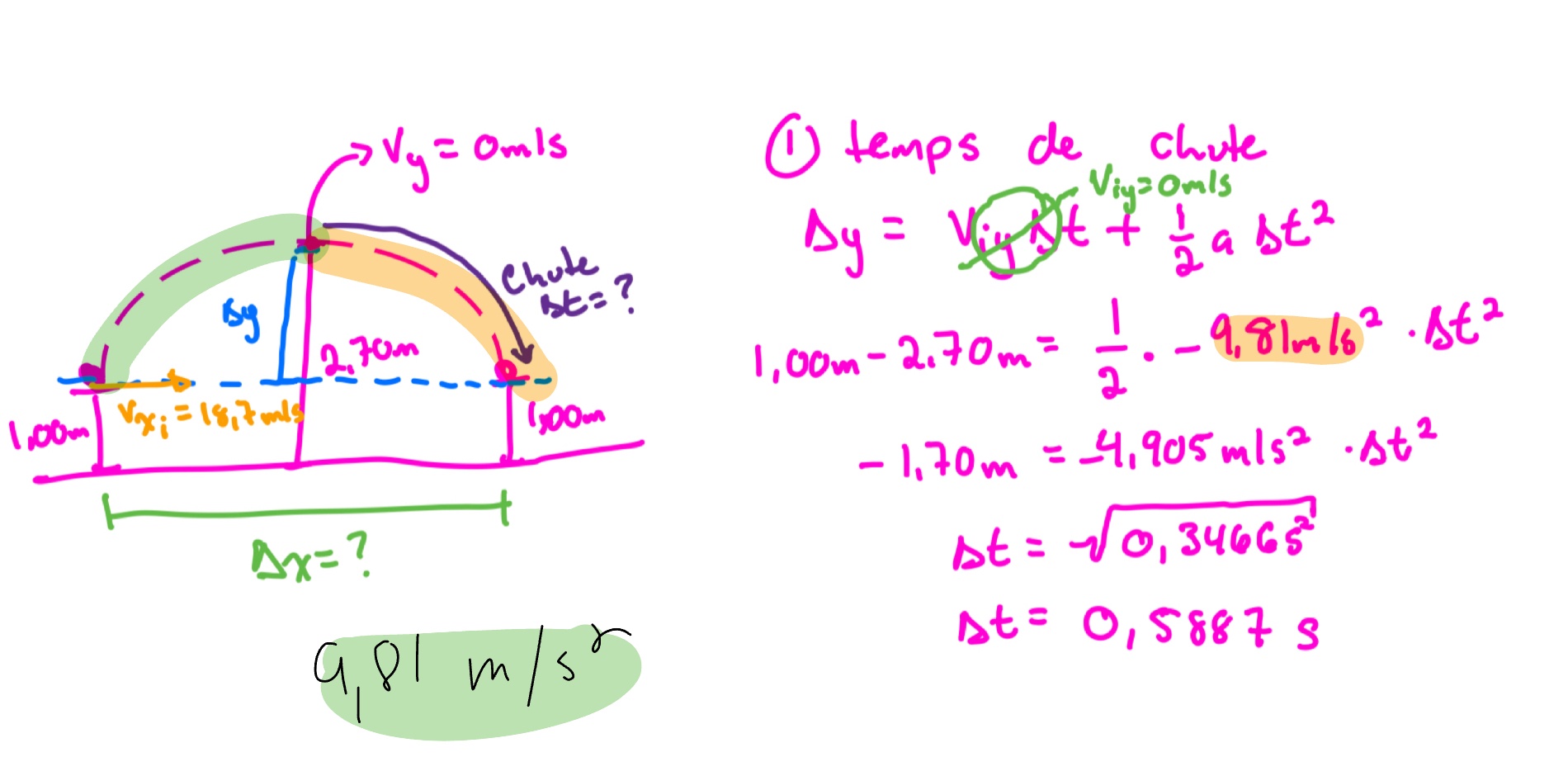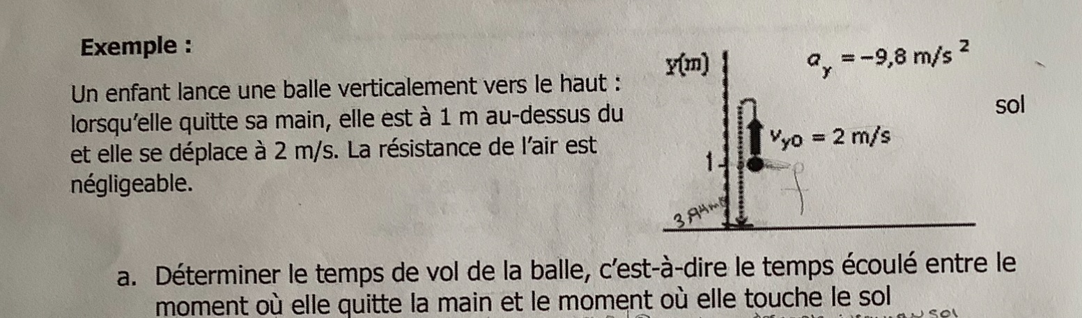 Dans la première partie d’une projection d’un objet jusqu’au sommet, est-ce que l’accélération verticale est positive? Avec cette logique, La deuxième partie sera négative?Pour ce numéro, théoriquement, est-ce que c’est correcte d’utiliser un déplacement Y positive (1,7m) avec une accélération positive au lieu des deux variables négatives comme illustrés dans les calcules.