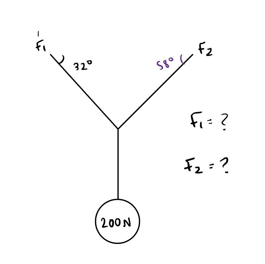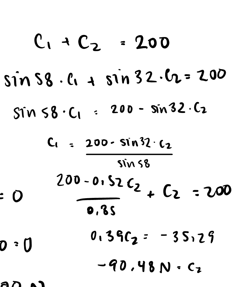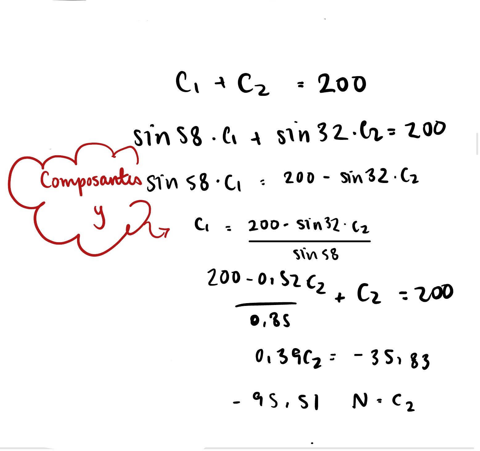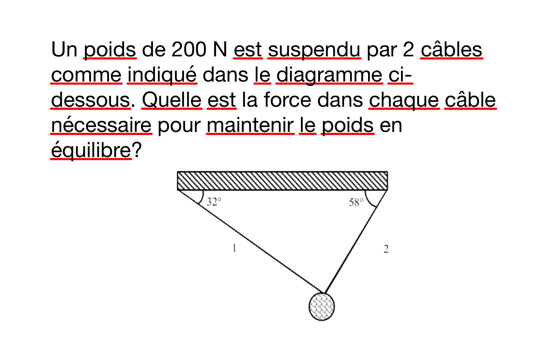 Secondaire 5 • 10mJ’ai demandé il y’a quelques heures par rapport à cette question. J’ai ajouté la question. Par rapport à la question, j’ai essayé de faire une système d’équation en combinant les composantes y qui vont être égales à 200 N. Cependant, j'ai obtenu la réponse comme un chiffre négatif. Est ce qu’il y’a un moyen de faire ce problème?