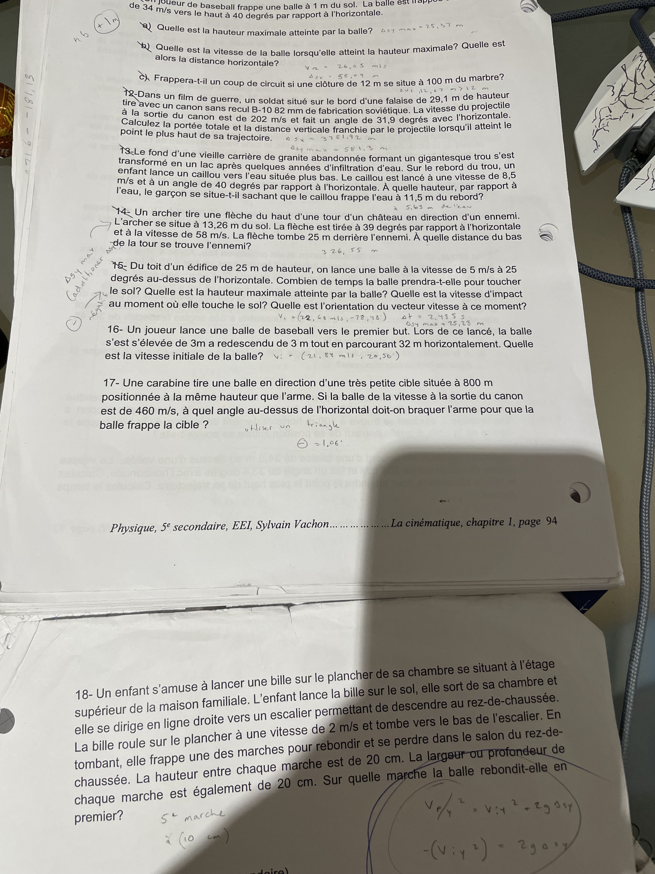 Secondaire 5 • 10mBonjour pouvez vous m'aider a resourdre le n17 et n18 svp. c'est urgent. Merci!17- Une carabine tire une balle en direction d'une très petite cible située à 800 m positionnée à la même hauteur que l'arme. Si la balle de la vitesse à la sortie du canon est de 460 m/s, à quel angle au-dessus de l'horizontal doit-on braquer l'arme pour que la balle frappe la cible ?