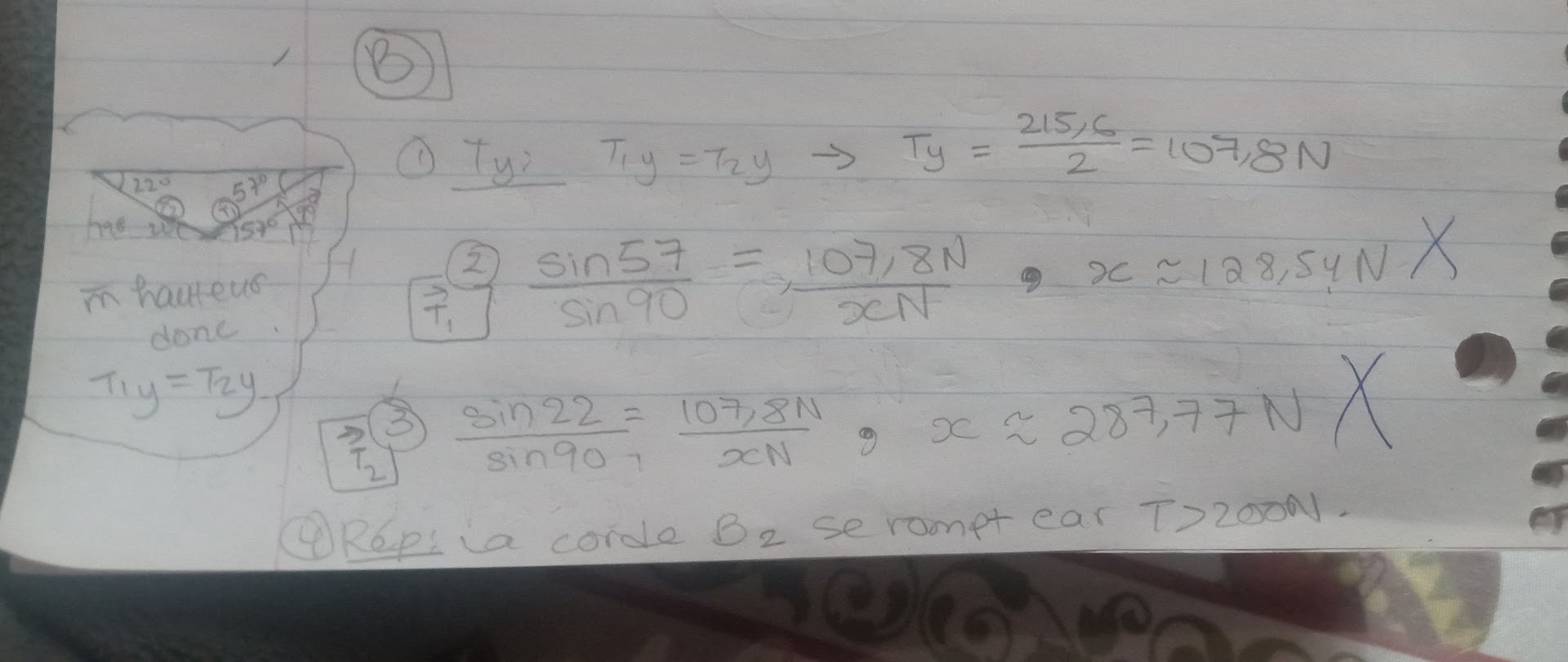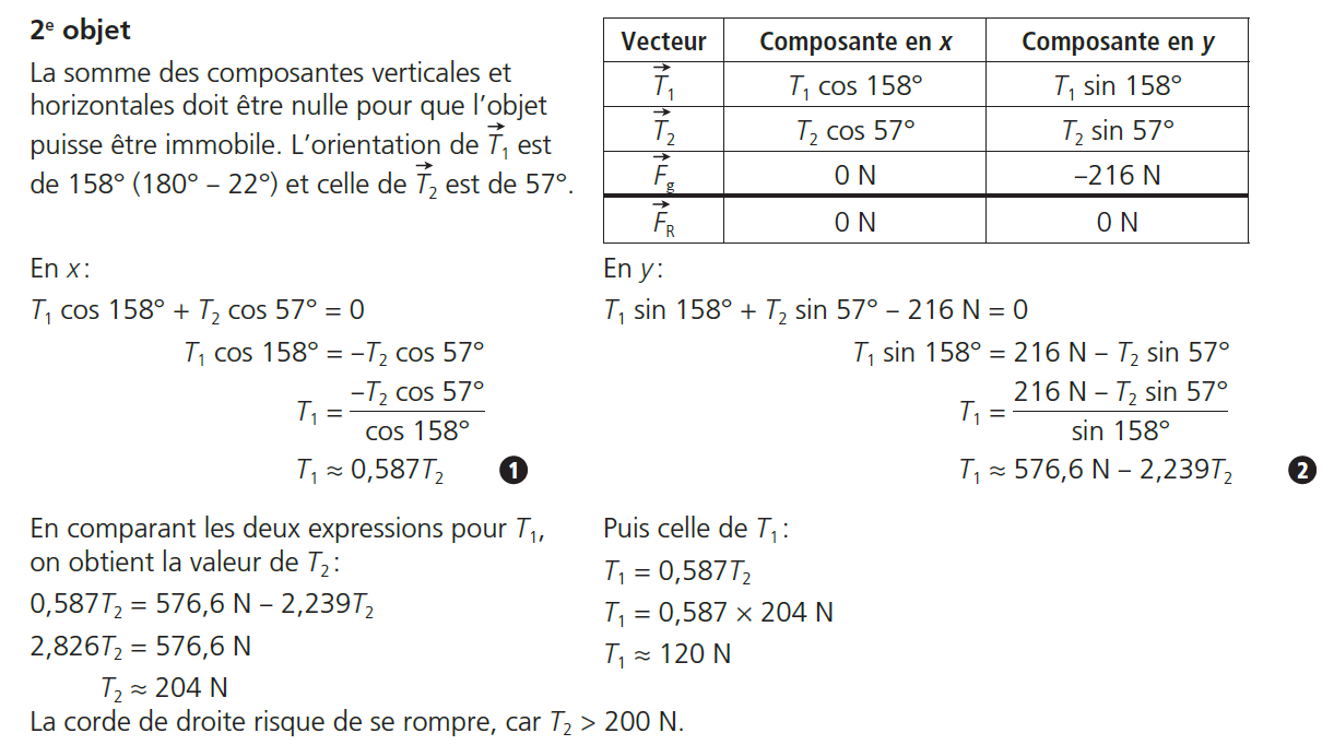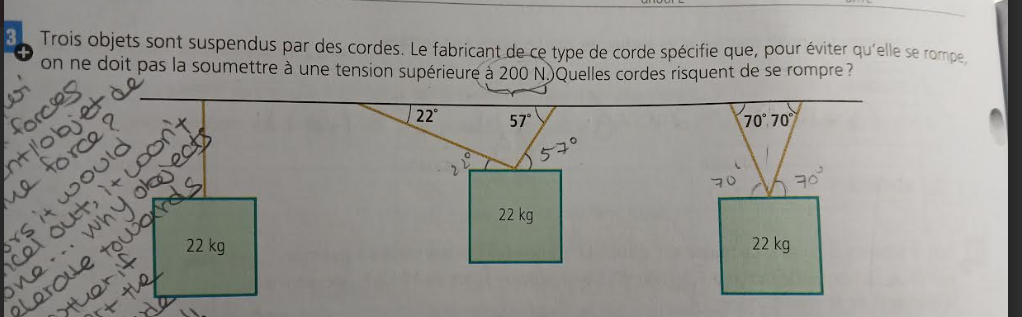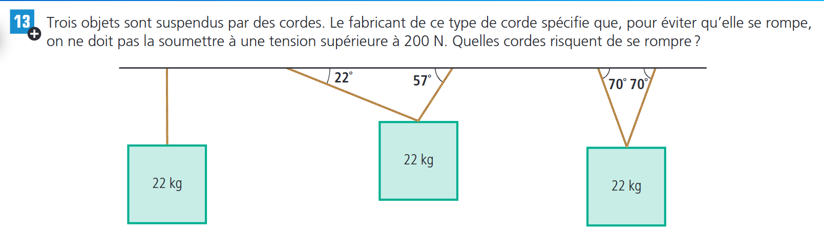 En voici un problème qui me bloquait:En fait, ce que qui me bloque c'est quesi je dis que la somme des y composantes est égale au poids,alors je ne trouve que les variables qui me donneront exactement le poids des 22 kg...Mais, comment puis-je confirmer que la tension de la corde est égale au poids dans ce cas particulier, car la question elle-même me demande qu'il pourrait y avoir des cordes qui ne respectent pas cet équilibre, soit le fait que les deux forces contraires s'annulent?Pouvez-vous m'aider svp :_(