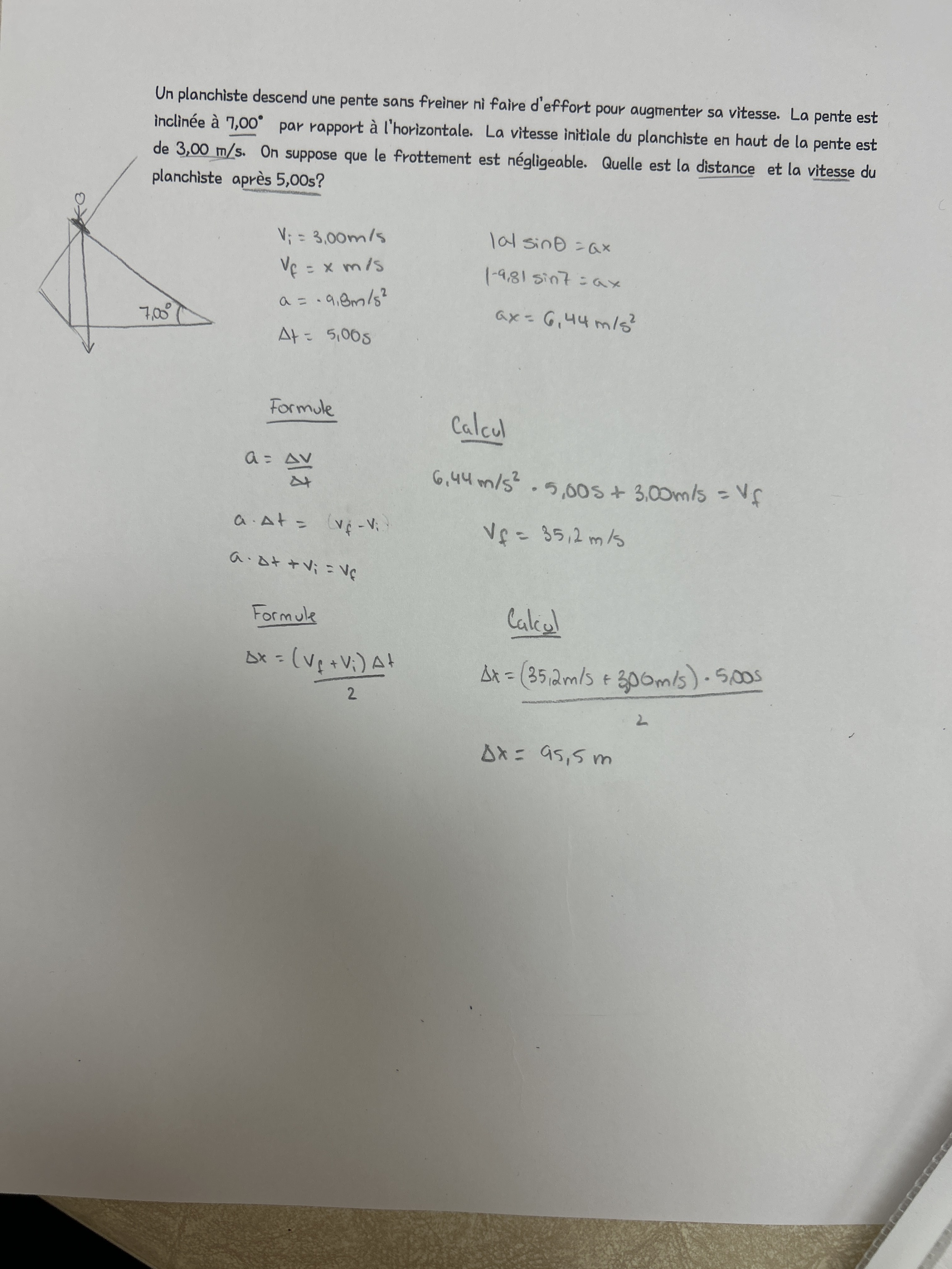 Secondaire 5 • 10mIci j’ai fait la somme des forces en x ( Px- Ffrottement ) est égale à l’accélération fois la masse, donc