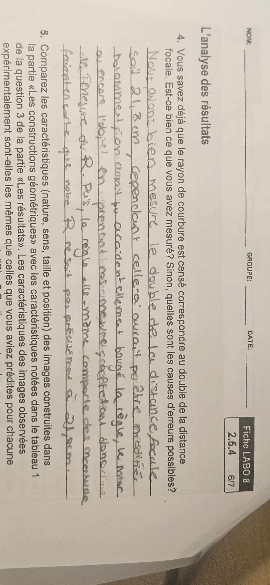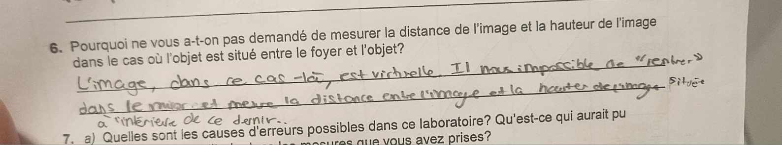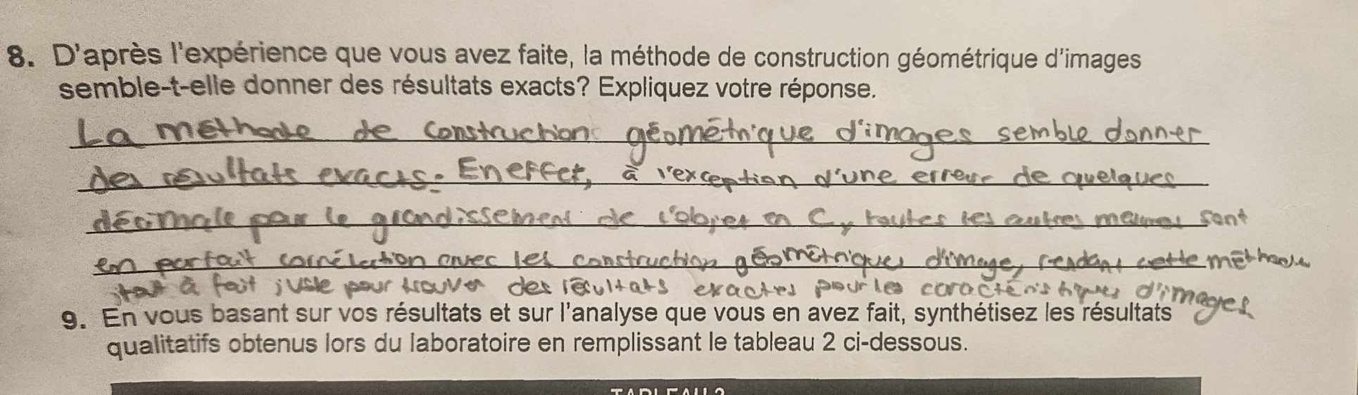 Nous avons essayé de bien mesurer le double de la distance focale soit deux fois 10,9 cm. Cependant, il y a de très grandes chances que celle-ci aurait pu être imprécise. En effet, on aurait pu accidentellement bouger la règle, le miroir ou encore l’objet en prenant nos mesures sur l’écran avec notre règle, affectant donc la mesure du R. De plus, la règle elle-même comporte des incertitudes faisant en sorte que le mesure ne peut point être précisément à 21,8cm.